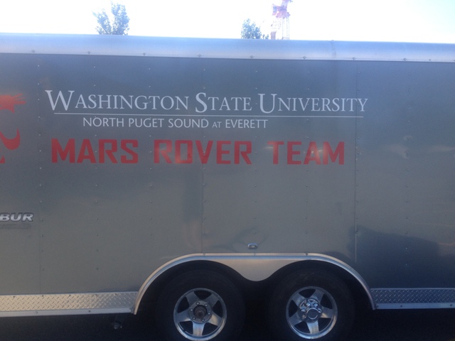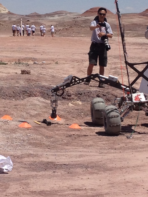 I told you the first day went well but we were a bit worried about the second day due to our soil analysis sensors not working correctly at the time. It was also a bigger deal than we realized to get into the top 15 teams, cause no first year team had done that in the competition's history. Second day we started out the day by taking a soil sample and dumping it into a sealed container on our rover, this sample would then be analyzed later and we would present the results to the judges. Anyway, next part of day one went worse than we had hoped. We had a very articulate claw that could spin things and turn things very well. The second task involved hooking a carabiner to a cart with a gas can on it, traveleing to a little station. Then you open the gas tank, poured the gas in, closed the gas tank, un-screwed a regulator and put it on another regulator socket thing. After this was all done you pressed a button on a panel and read the voltage output. Keep in mind that this is all done by a guy with a controller in a uhaul trailer and two cameras but no way to communicate with us outside or see the rover. Not exactly easy, but possible. Anyway at one point he scraped the claw against the battery box and it ended up shorting so we lost claw movement and lost a decent amount of points on tasks that we wouldn't have had problems doing.