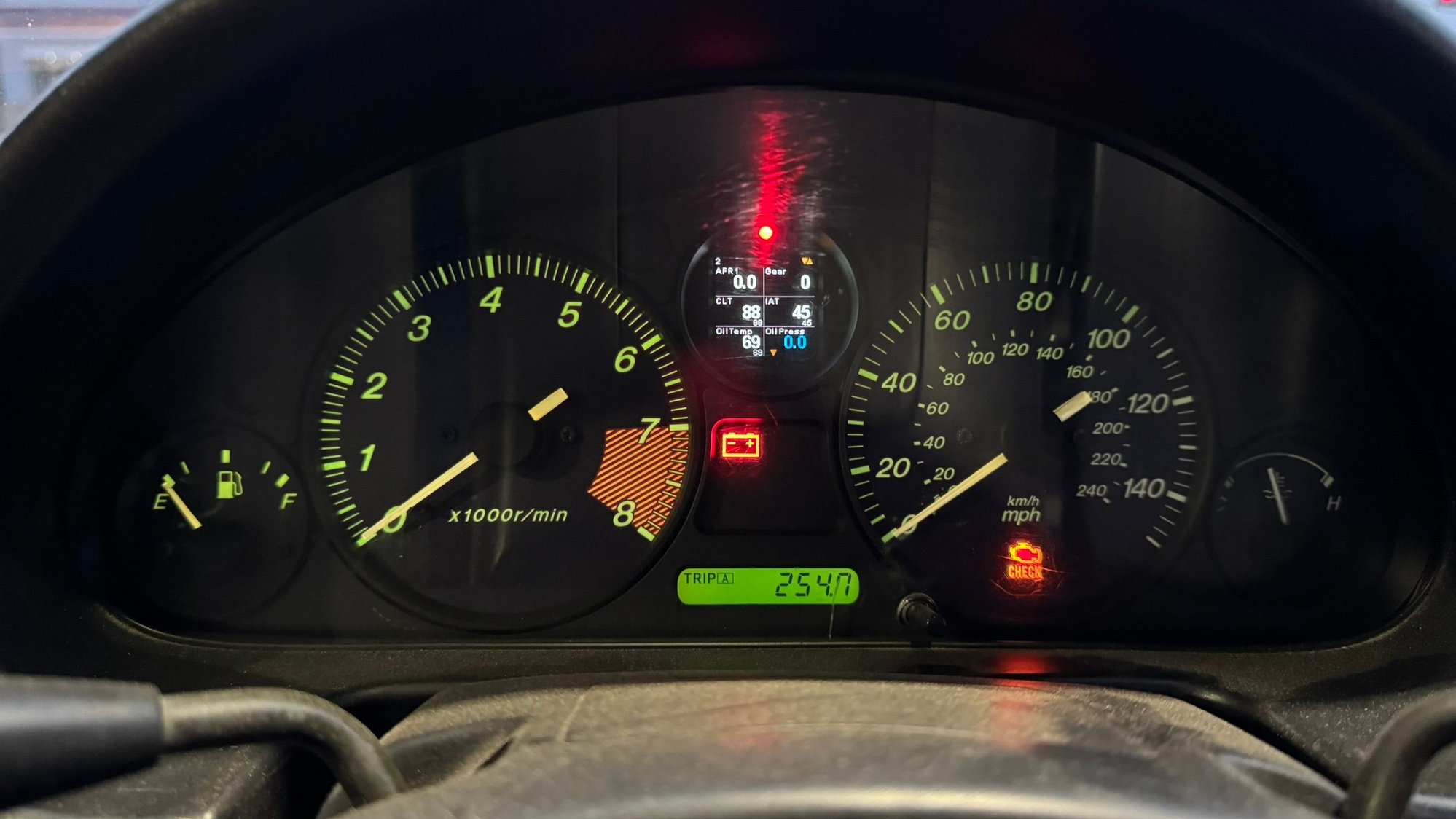 But in due time I went to take the car for a drive to make sure the tires didn't rub too much, only to find it wouldn't start. Checked the coils were working, the ECU was happy with CAS and CKP, it had sync, it was firing the injectors, but it wouldn't come to life. The cranking seemed slow, so I suspected the battery. To be safe, I charged it full but it still wouldn't start after. At that point I believed the engine had flooded. After many flood clear cranks, it finally stumbled to life and ran! I let it idle until operating temp to recharge the battery and clear its throat, then took it for a spin.