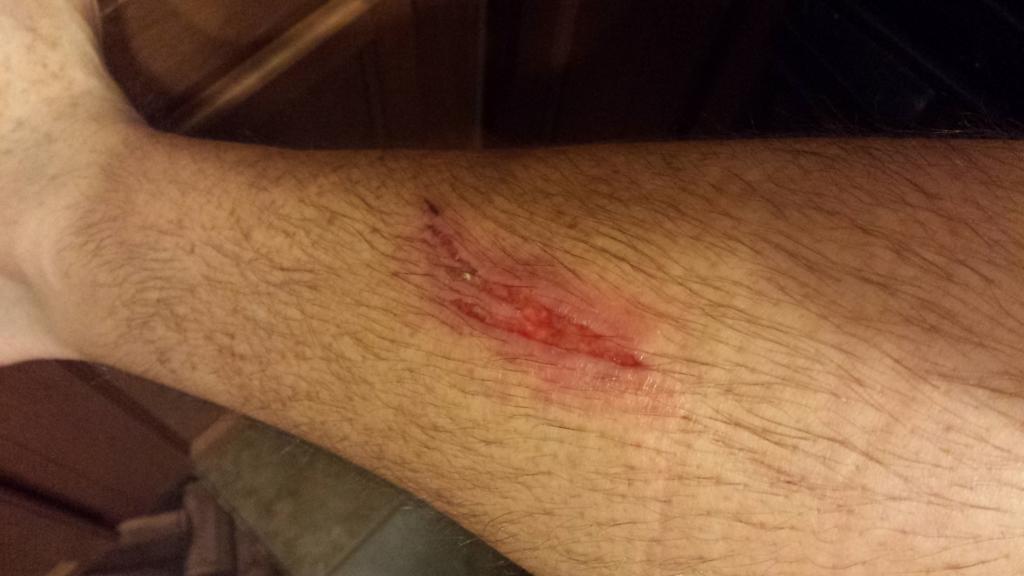 this boys and girls is why you keep a clean shop and dont leave sheet metal next to walk ways where it can attack you.