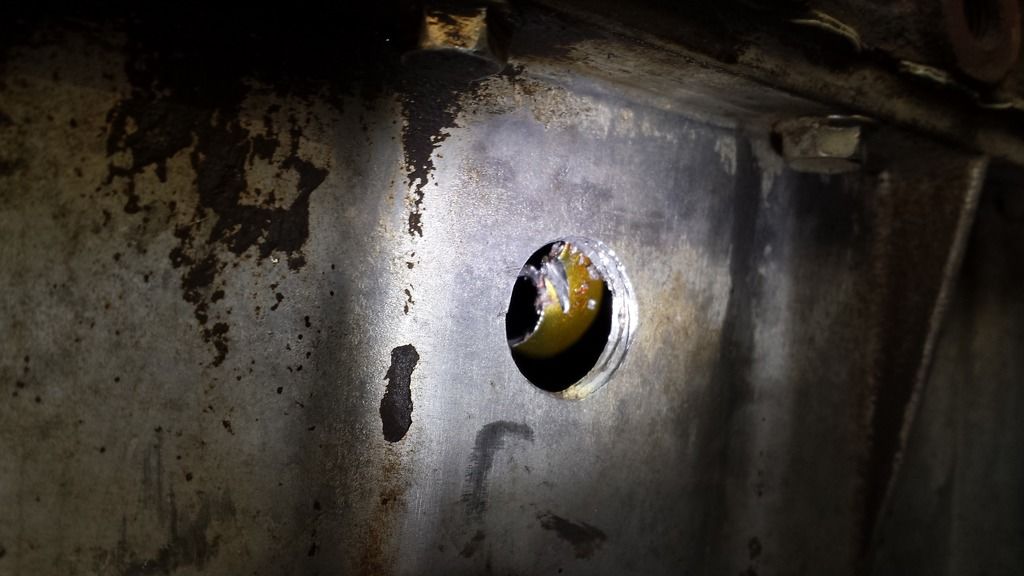 You can see the hole I drilled through the tray, and where the tap was starting to cut into it when it bottomed on the tray. The tap cut demonstartes the curvature of the tray.