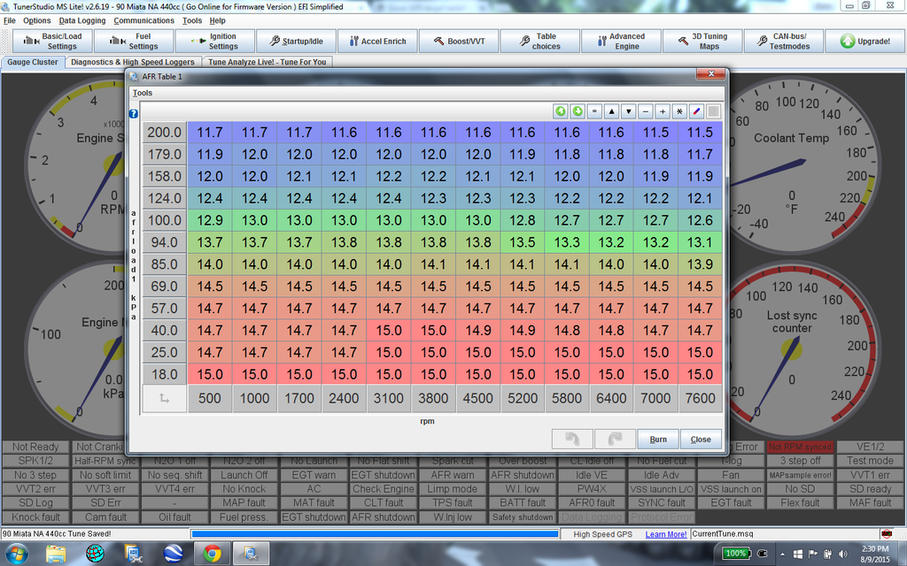 This is a track only car, no care about cruise AFRs for fuel mileage. Having said that, my NA tune had me cruising around 16:1, and the NA section of your spark map is almost identical to mine. Thanks for the maps aidan.