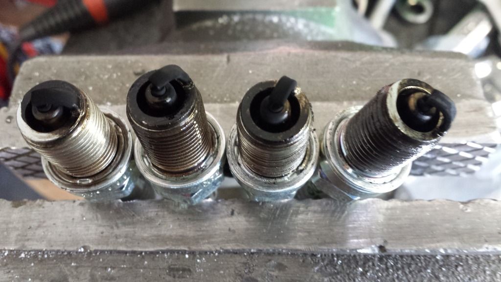 so I pulled the plugs, theyre covered in oil. Keep in mind this is about 20 minutes run time total on these plugs. 1-4 from left to right, you can see where I just wiped the oil off of 1 and 4. So I think this rules the turbo out, at least as the only cause as it might be contributing.
