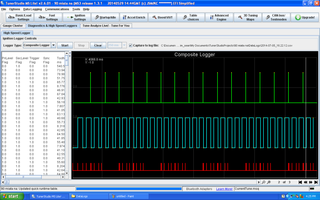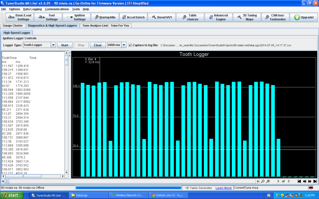 im having trouble doing logs. i cant seem to get a composite log, and it took a while to get a tooth log to show up. its acting eratic, data will flash on the left pane for a moment, maybe with or without a graph and i get "Empty read, No Data Received from Controller". once i set the "time" drop down menu to 4000ms in the tooth logger and hit the start and stop button under 4 seconds before and after cranking it, it will show and hold a graph. what does that drop down menu control? is it just coincidence? i then figured out how to save a log.