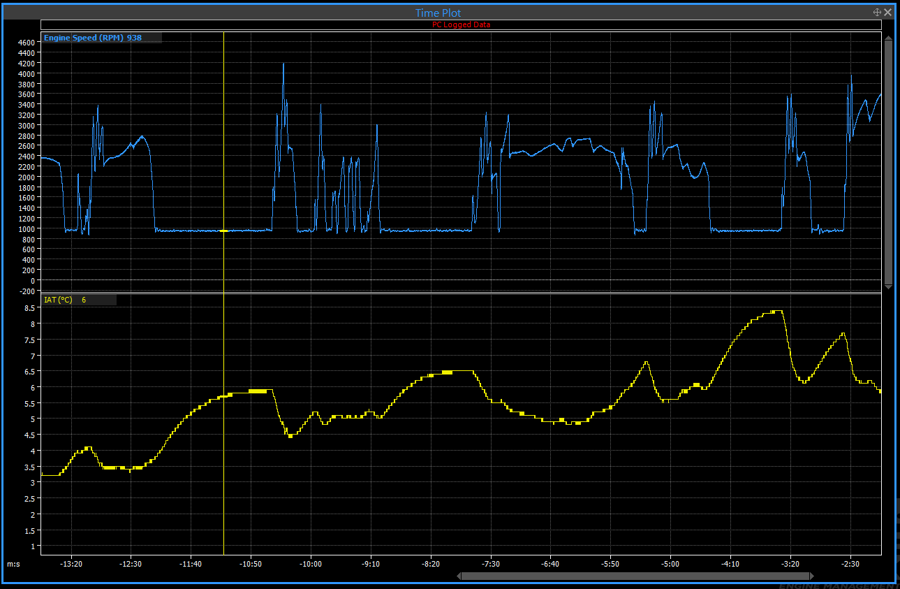 Here's another log I had. You can see the IAT got to 28 C (82 F) after it sat for a bit. Lowest it got to was 9 C (~50 F) but I would assume ambient on that day was at highest about 5 C (~40 F). You can see how it correlates with how quick the car is moving.