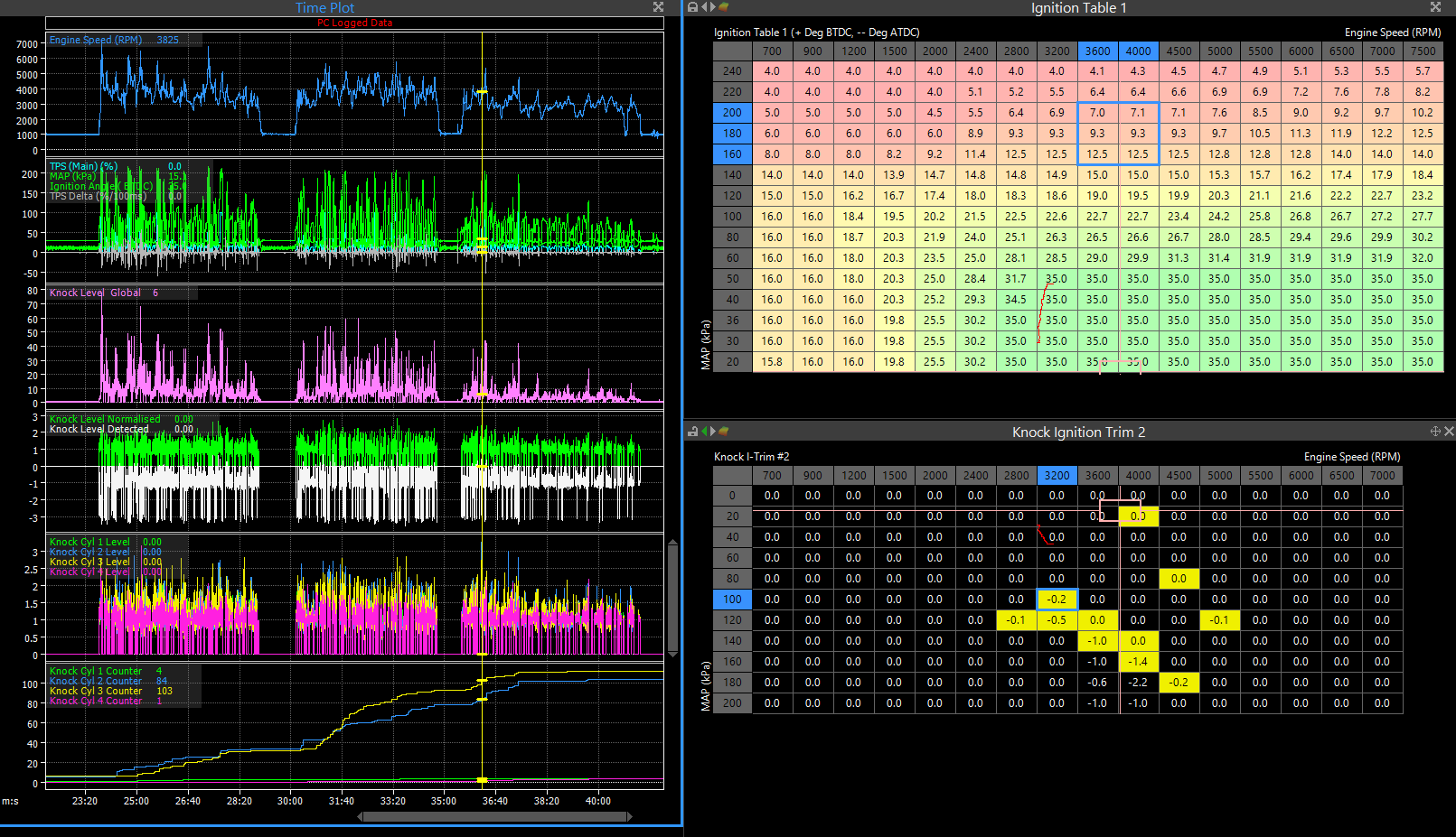I also picked up a ton of hits on the knock sensor during the drive, but only on cylinders 2 and 3. Cylinders 1 & 4 had 4 knock events each while cylinders 2 &3 had over 100 each. Not surprising I suppose given that the sensor is centered around cylinders 2 and 3, but I figured the knock windowing would help compensate for that. Most of those were spiking around 3, so I'm not as worried about the spikes I was seeing with my old spark map which were up past 7 IIRC. I've already pulled a lot of timing since installing the knock sensor, but I guess I might pull more. Tangentially related, a flex fuel sensor just arrived at my door courtesy of @Z_WAAAAAZ , so I'll try to find some motivation to get that installed sometime soon and then see about getting a better fuel pump installed.
