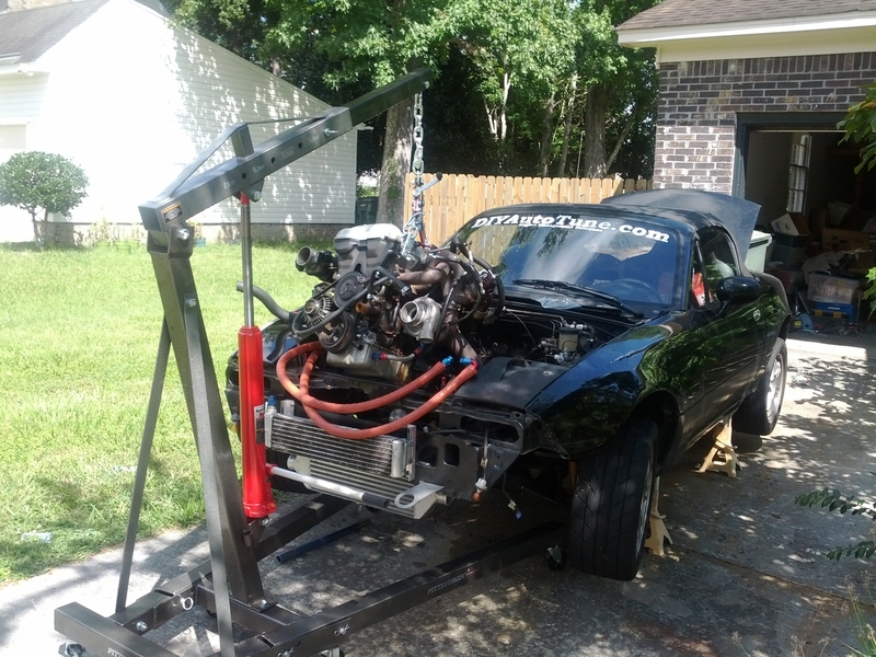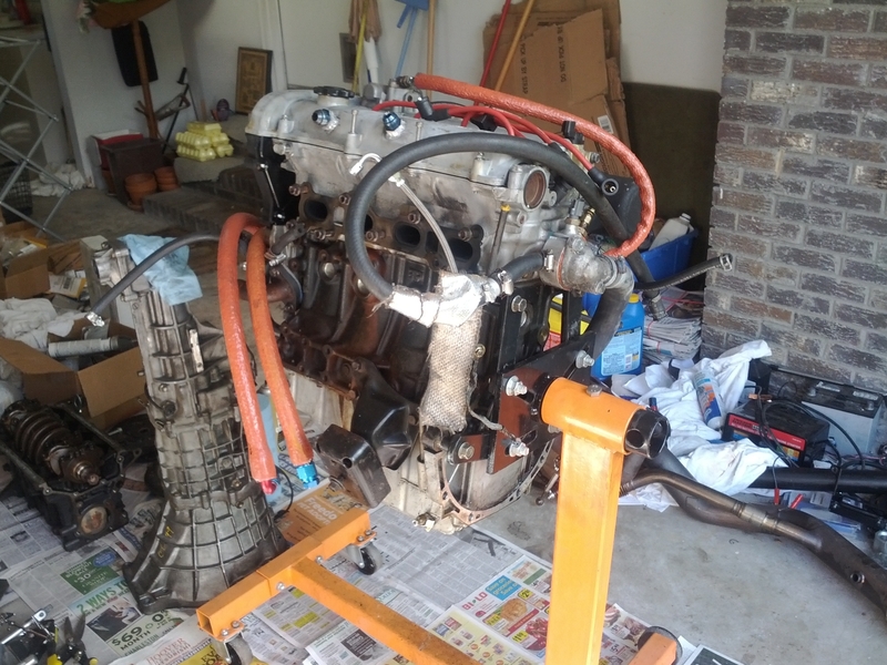 The engine is out of the car and sitting on its stand in my garage.