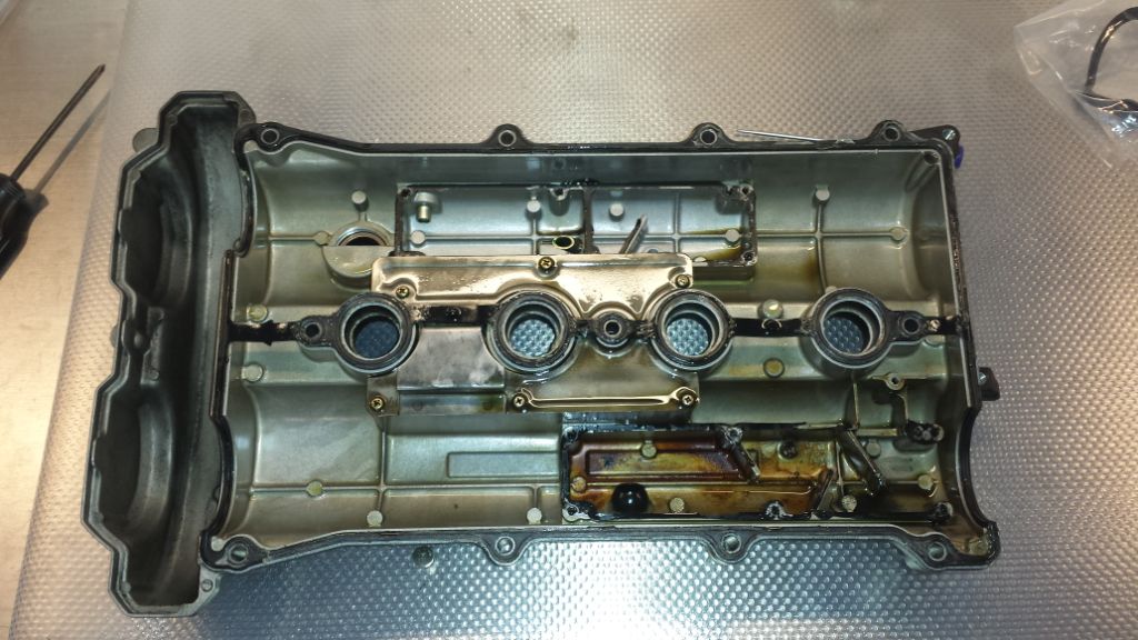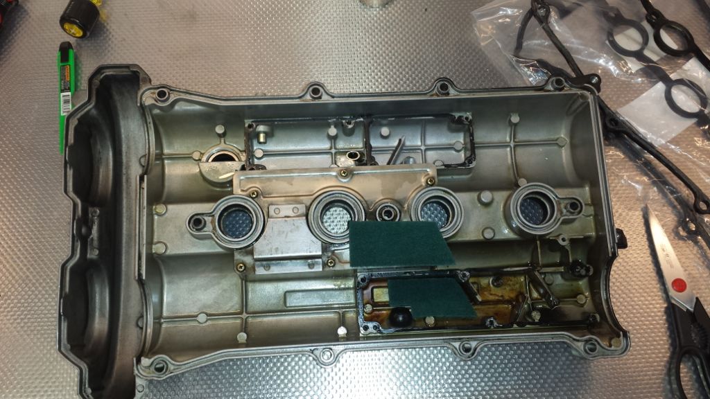 Half-measures--I've got an oil catch can, but before putting it on I wanted to try the valve cover vent route. It's half of Shiuend's solution as I only cut out half of the plates. I also used a new Scotch-Brite Green pad as I didn't have any stainless steel wool or copper wool on hand. The Scotch-Brite acted the same as a steel wool pad under a flame, so I figured it would be fine under engine temperatures.