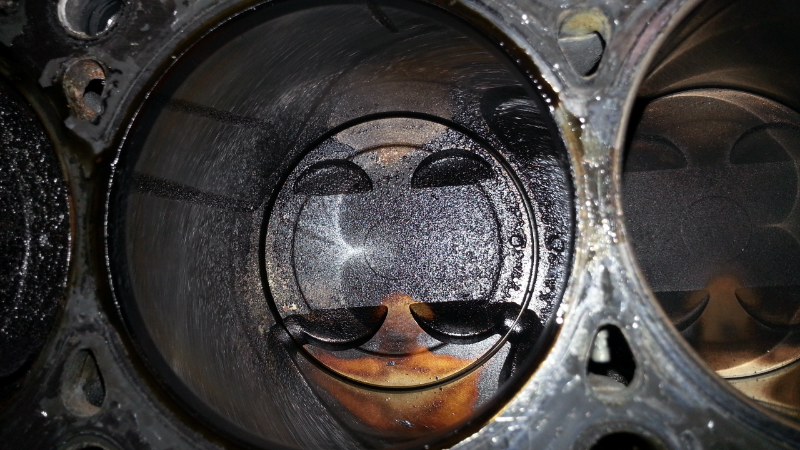 The head is off. 138k miles and some of it boosted on the track in hot temperatures and there is no sign of detonation or overheating. There is still factory crosshatch all the way up and down the cylinder bore. There is just a light touch of occasional carbon layering, which I expected.