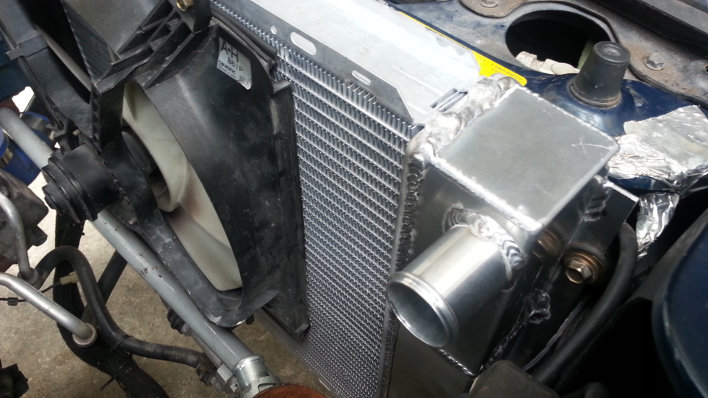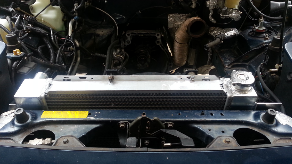 I also mounted my new super secret triple pass stock car radiator. It is a custom prototype. I think I will recommend he take advantage of about 1.5 inches of additional width available. It is also a little thicker than my Mishimoto 52mm.