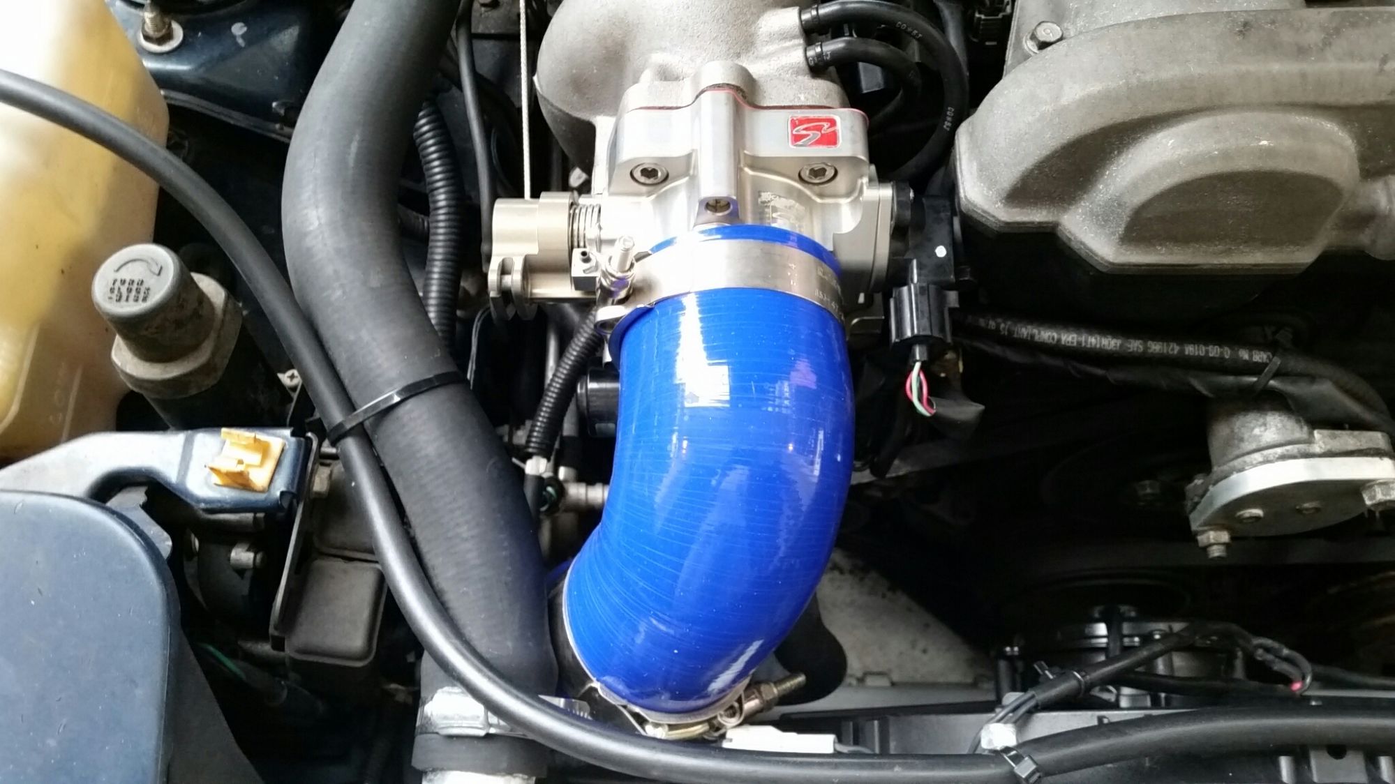 I installed the Skunk2 throttle body from Fab9. Nice piece of equipment. Using blue silicone couplers because Braineack hates them.