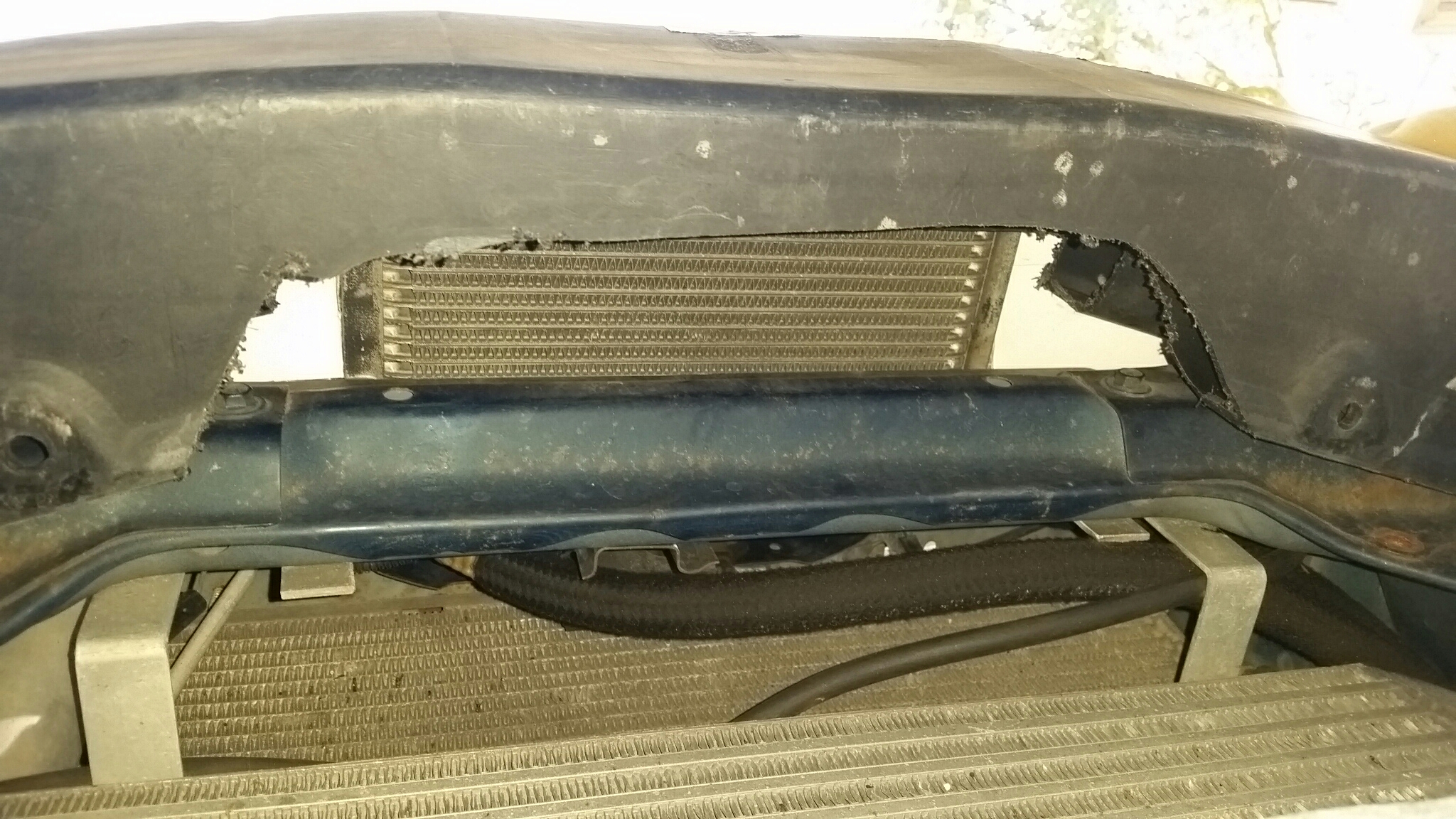 Bottom of bumper mouth opening was notched to allow air to get to the rest of the intercooler and to bypass the intercooler beneath it to get to the radiator. More air is necessary. And the radiator getting air is primary, intercooler is secondary.