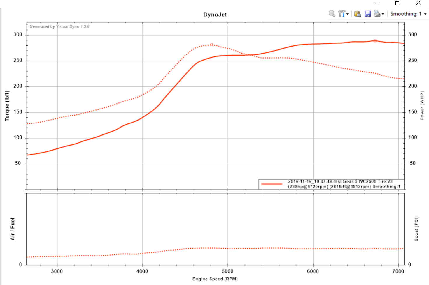 So this dyno pull is about 3psi more and with more advanced timing than the 262hp 252tq pull I did on the dyno at Daytona. Sounds about right.