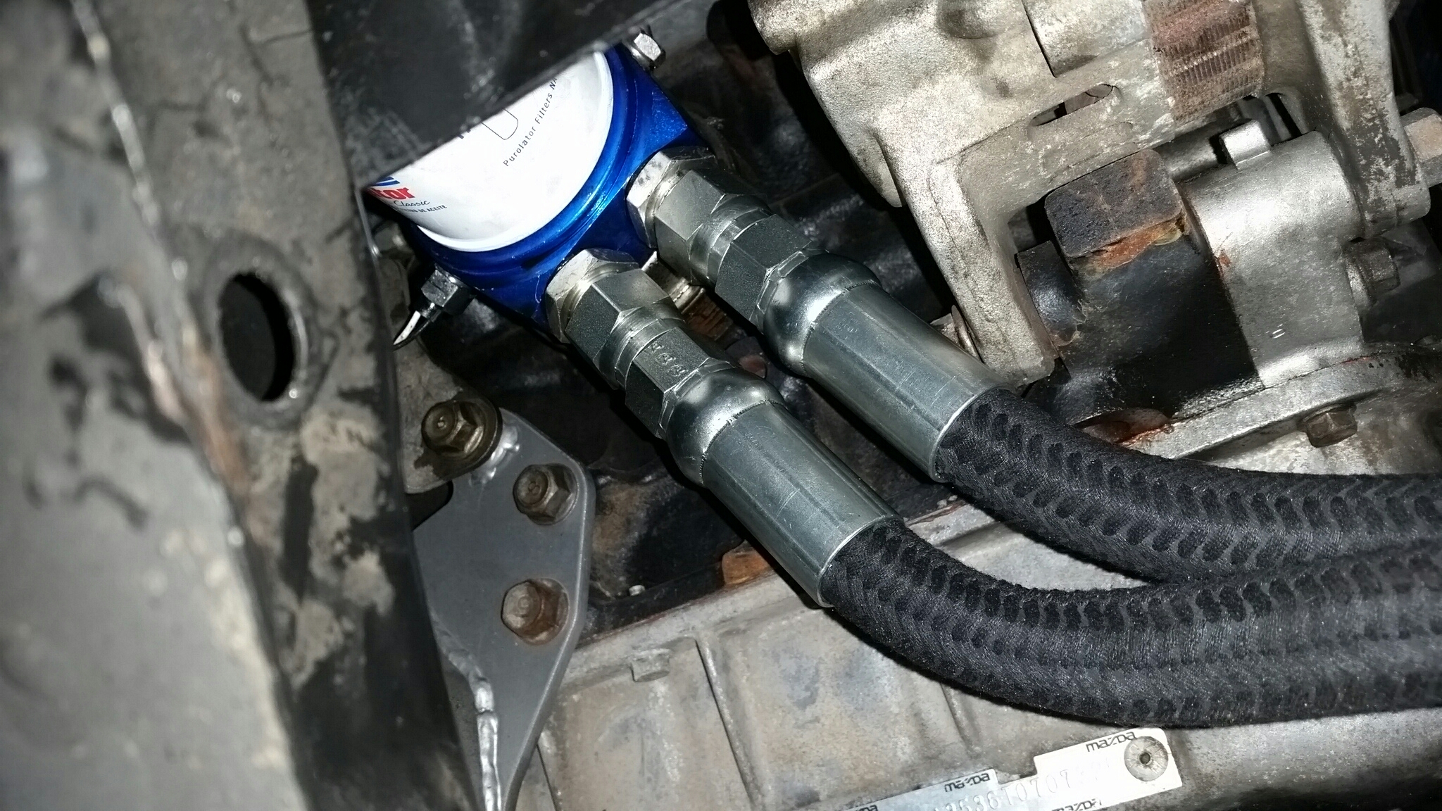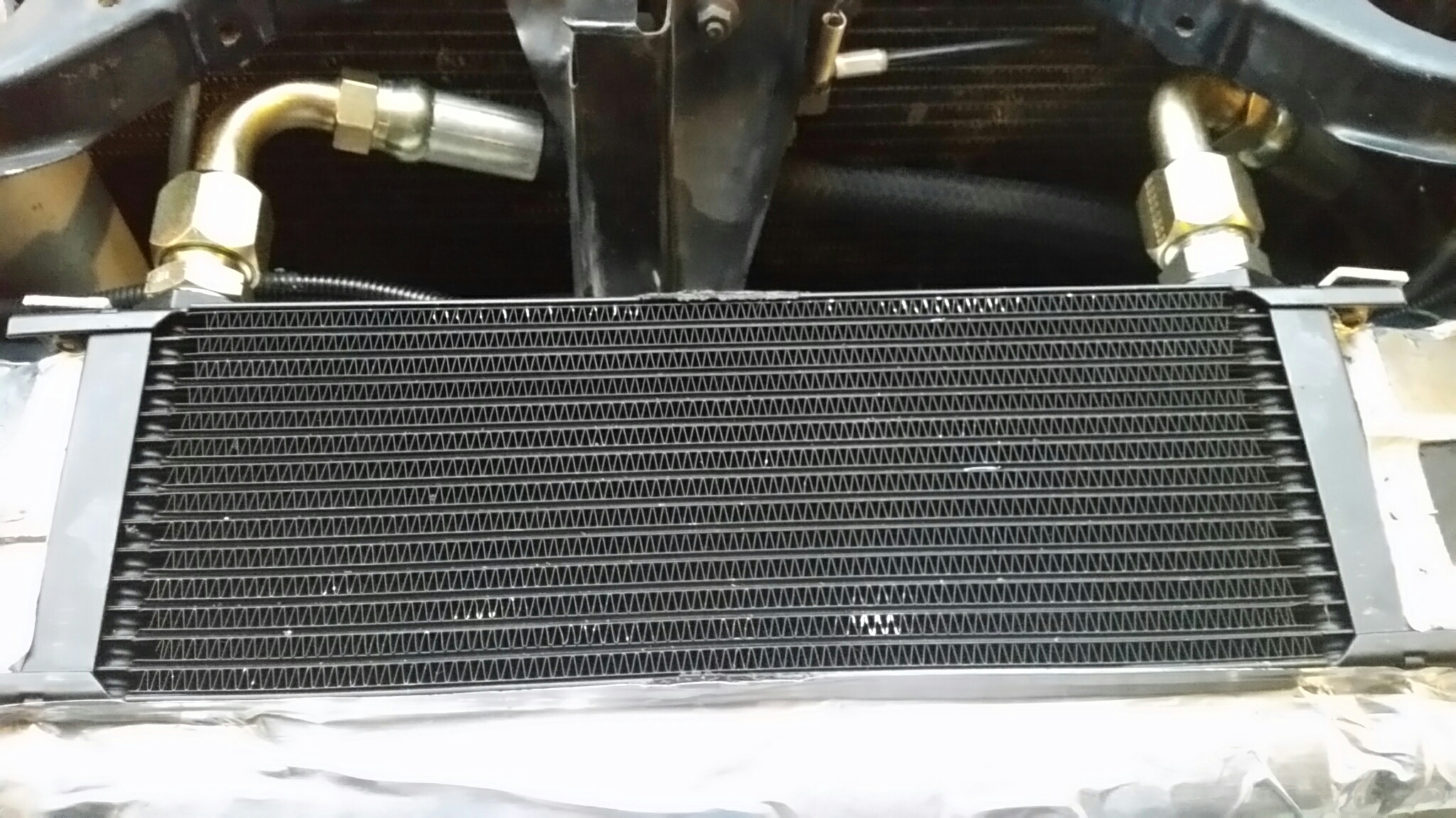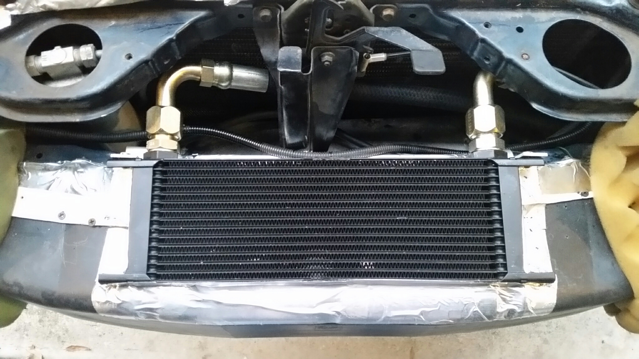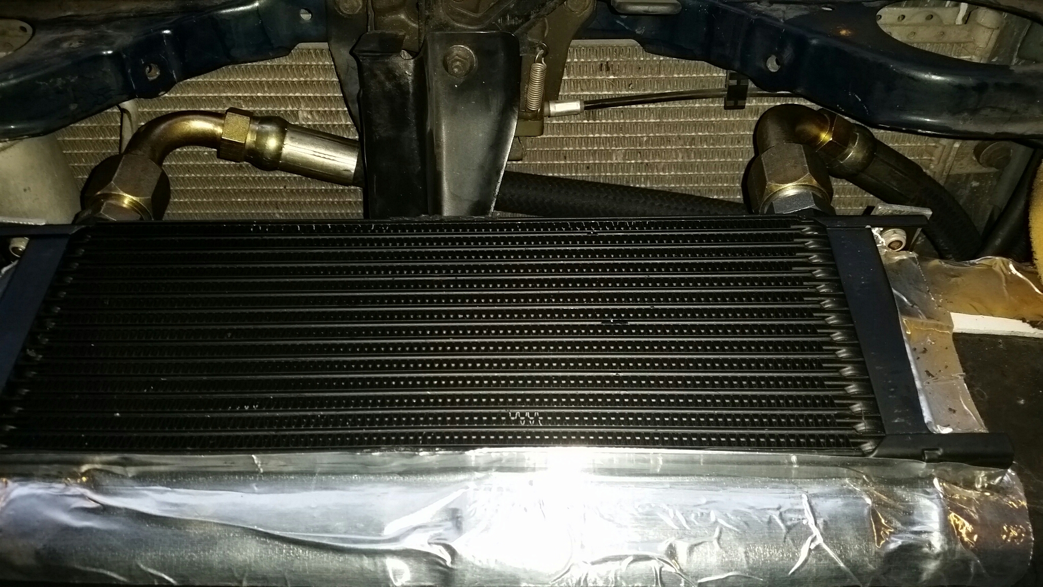 I also own an RX7 oil cooler and it would fit in the same location with different trimming. I debated which would be more efficient and decided the Setrab had many more fins per inch. The RX7 was longer and would require more cut length and I could always go to it later if desired.