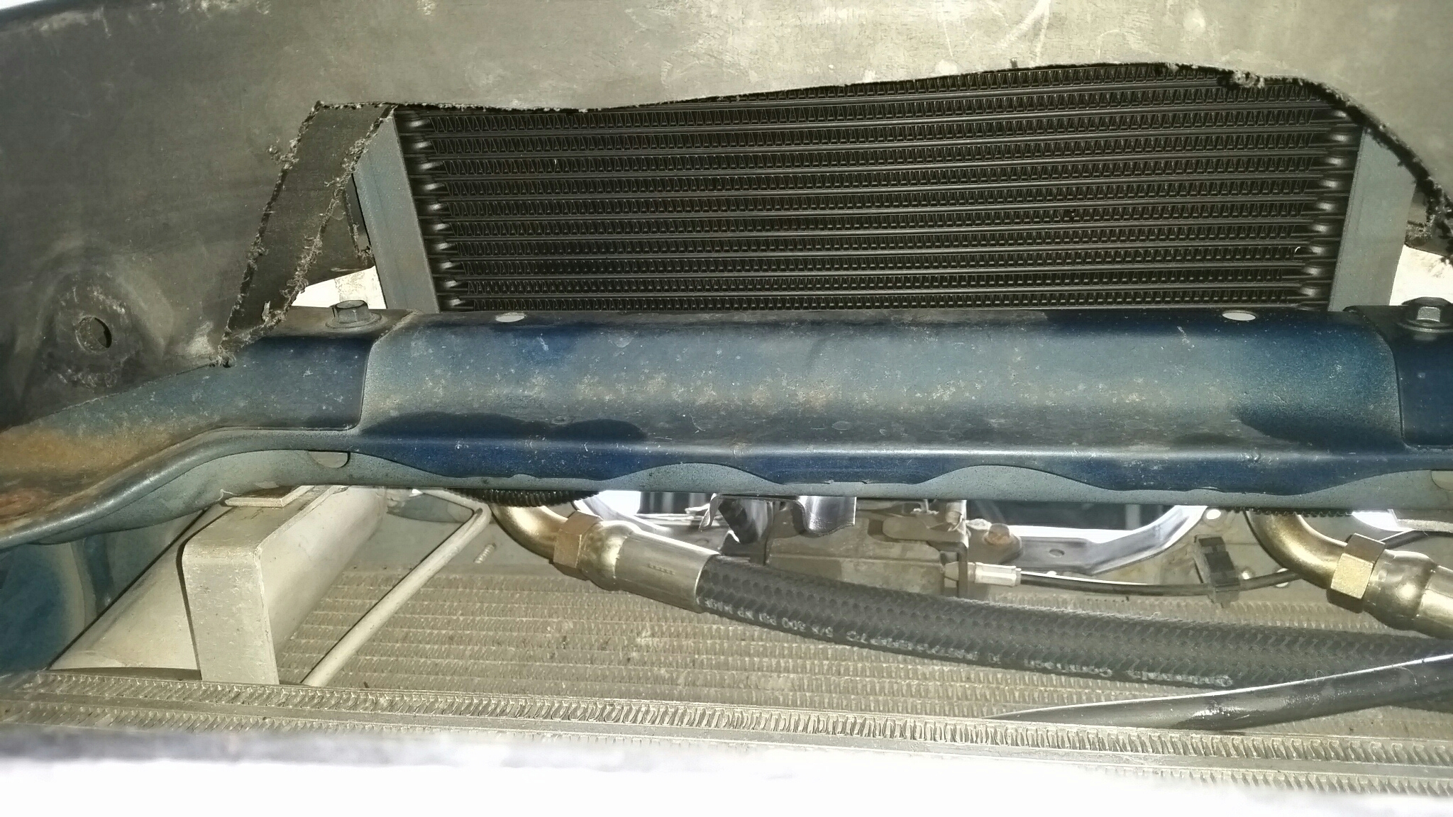 Yes, it is in the area I had previously opened up to give more air volume to the radiator. I simply opened it up a little more in a shape that matches the oil cooler. I couldn't get a good camera angle just now but here's some shots from beneath, looking up from the bumper mouth.