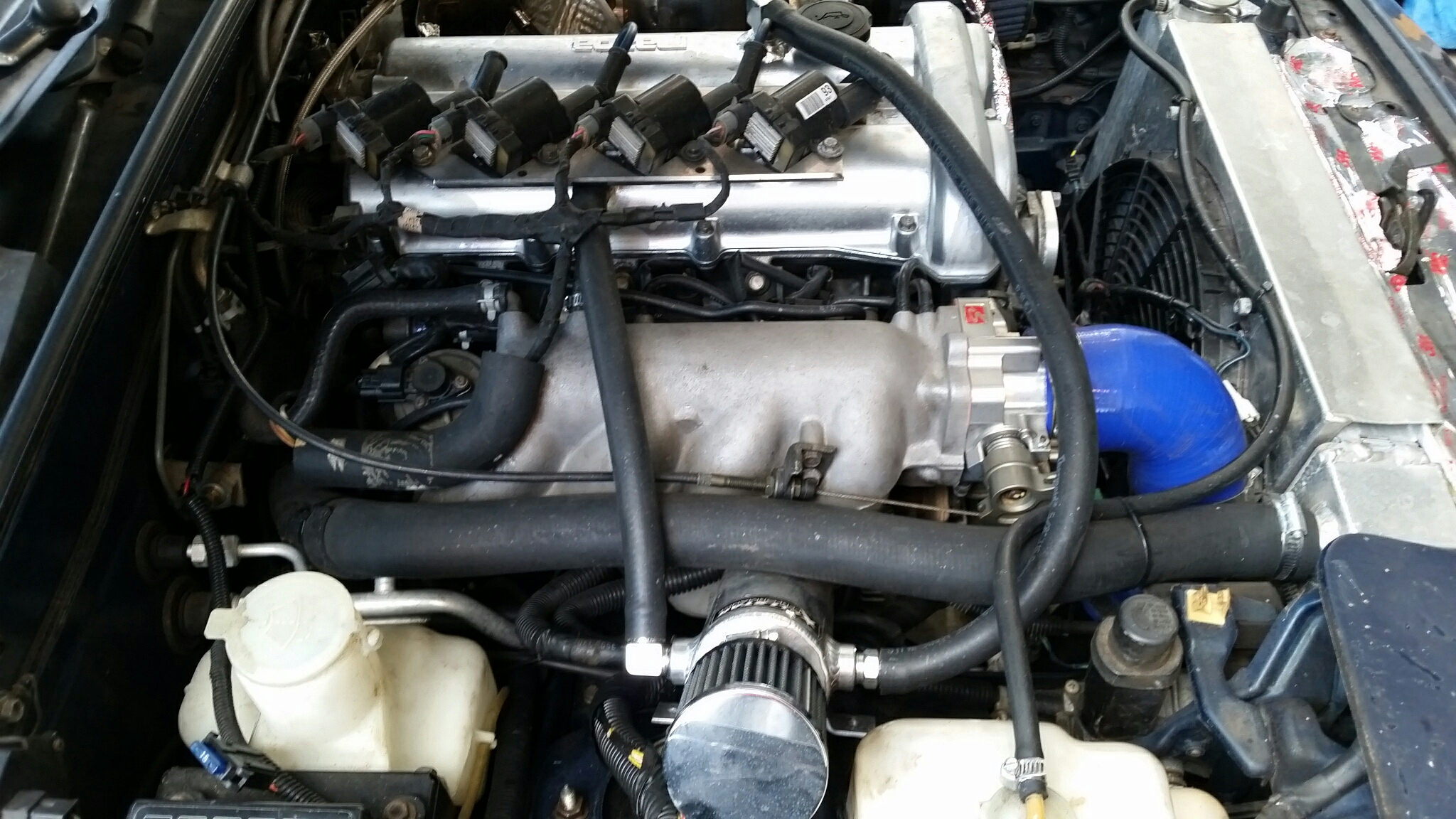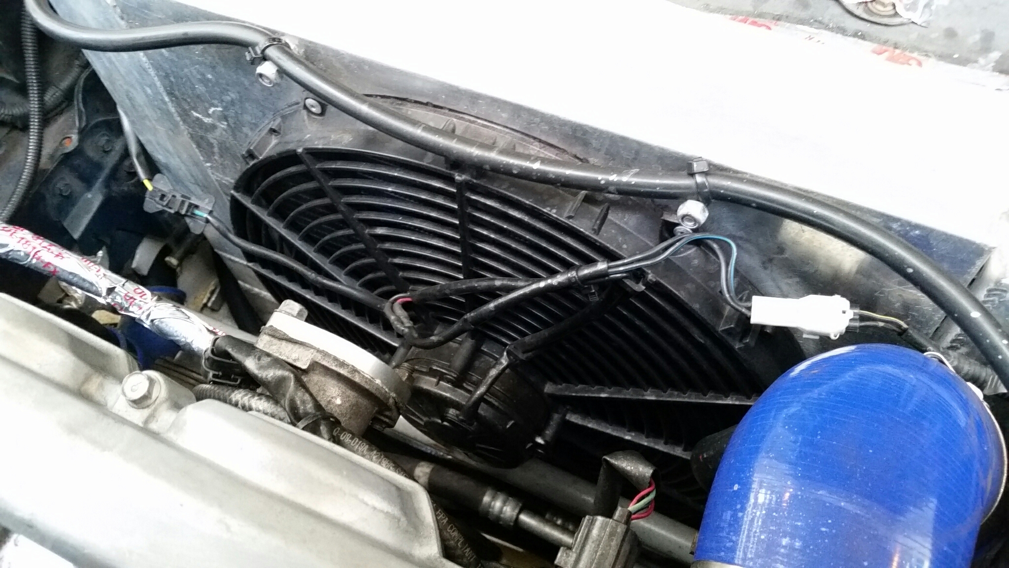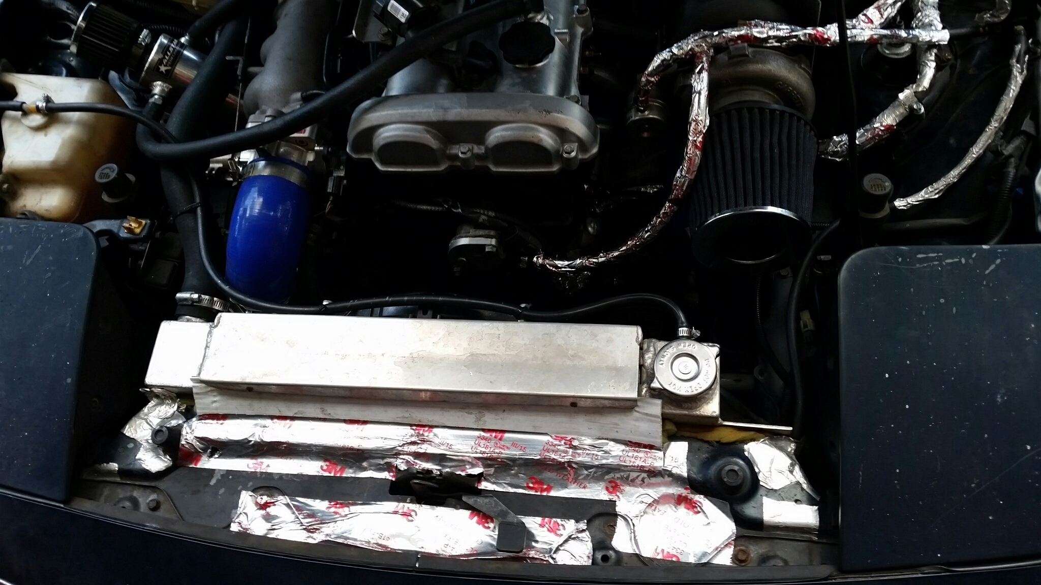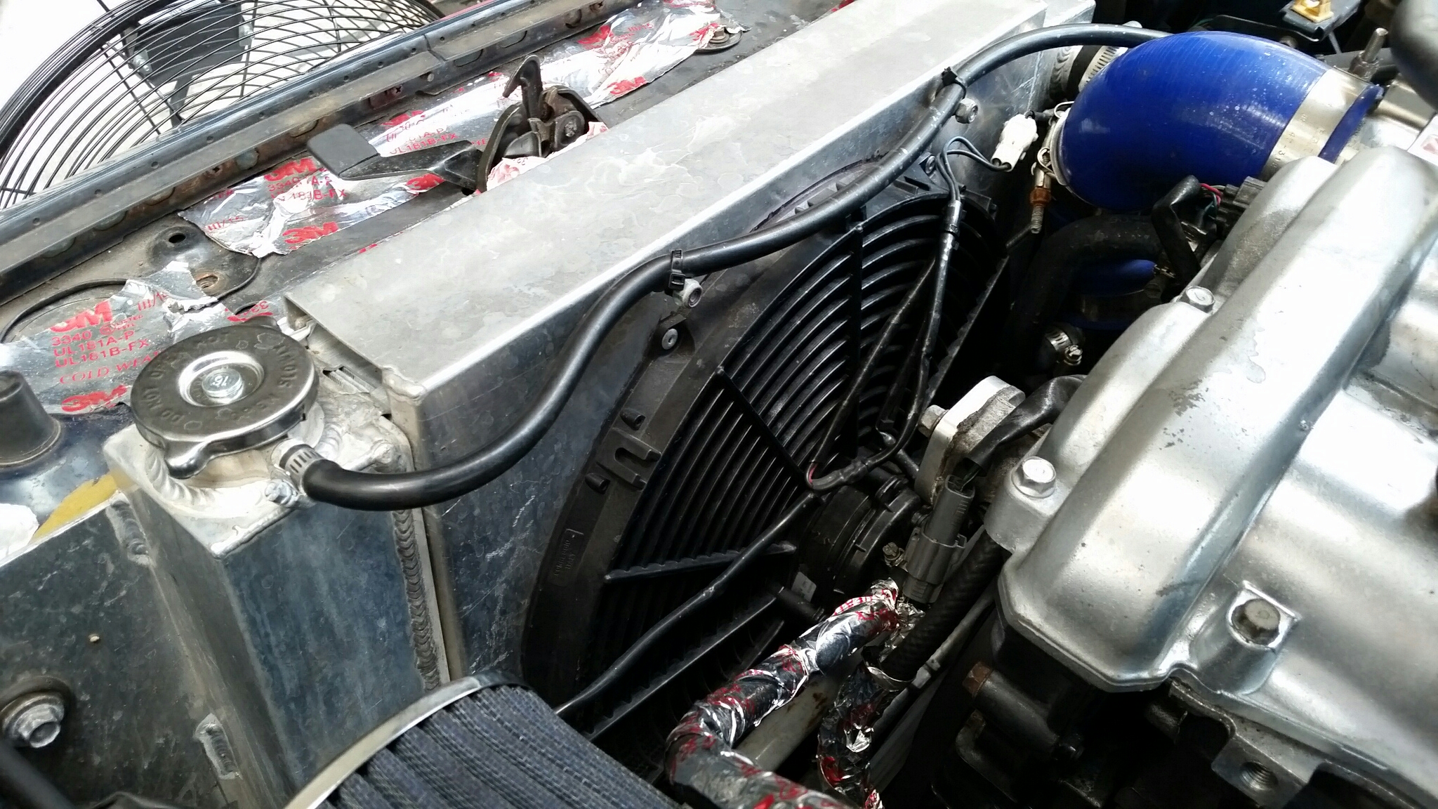 Other pics including customized triple pass stock car radiator and shroud, Spal fan, upgraded valve cover outlets with larger venting lines, and catch can temporary location.