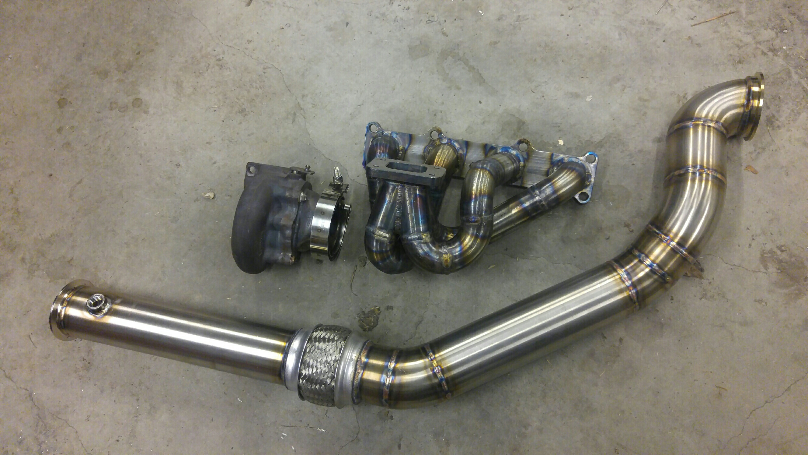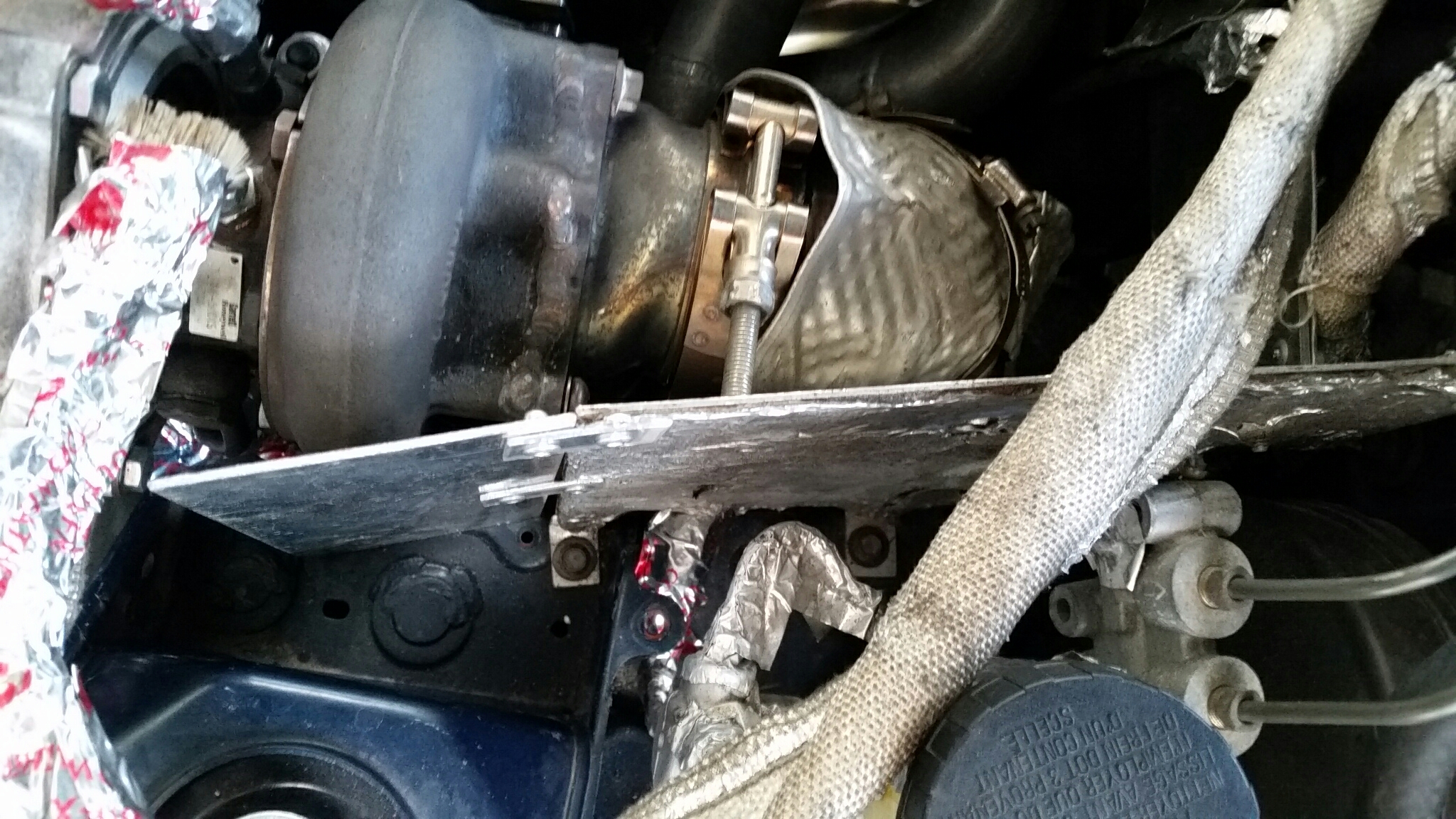 The downpipe shielding came from a customer's junkyard and was factory shielding for a poly fuel tank on a minivan or something. I wrapped it around the pipe and secured it with clamps. As seen in the videos, it's not as glamorous as a bare pipe but works incredibly well.