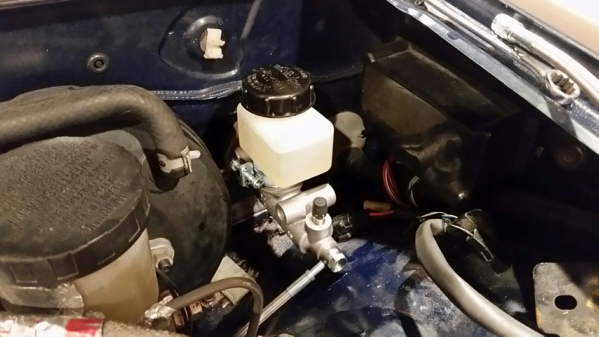Transmission bolted in. Clutch master installed. Getting the old clutch master pedal e-clip off with the rollcage just to the left of the clutch was tough. Couldn't see and had limited space. And I was laying on my back on the floor.