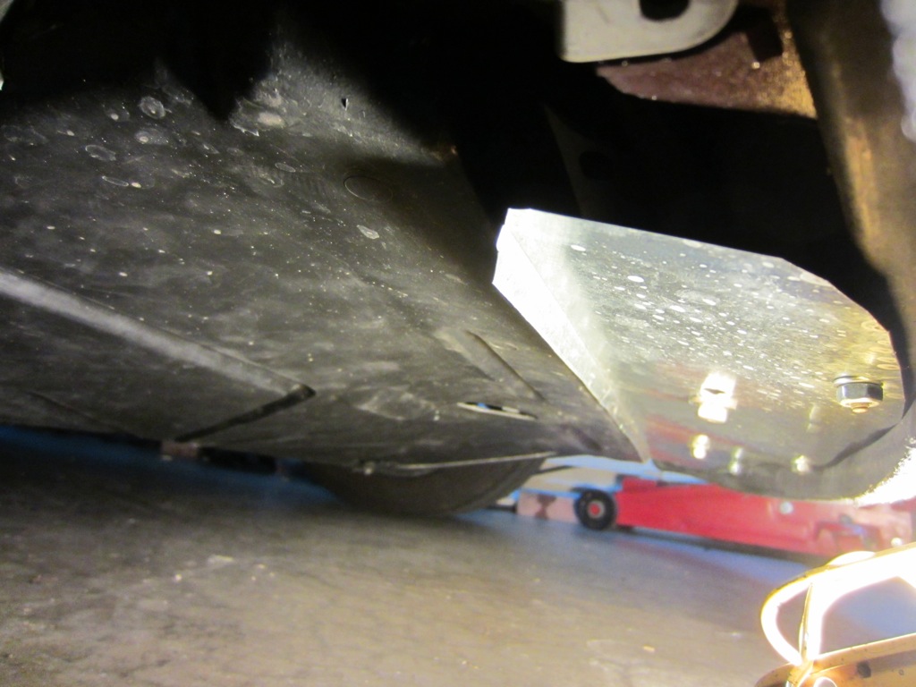 One thing I forgot: after trimming the front air-diverter that goes inside the bumper to fit the intercooler, there was about a 4-inch gap between the bumper and the splash shield. I worked up a "solution" with some ducting from Home Depot Racing and tin snips. It's secured fairly well at the rear to the two intercooler bolt holes, and at the front by the 3 10mm studs/nuts that fit under the bumper area. It isn't quite right and needs a little more tweaking, but tucks up nicely into the splash shield leading edge: