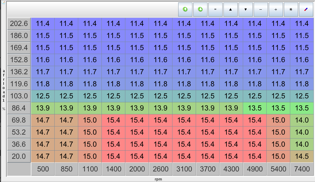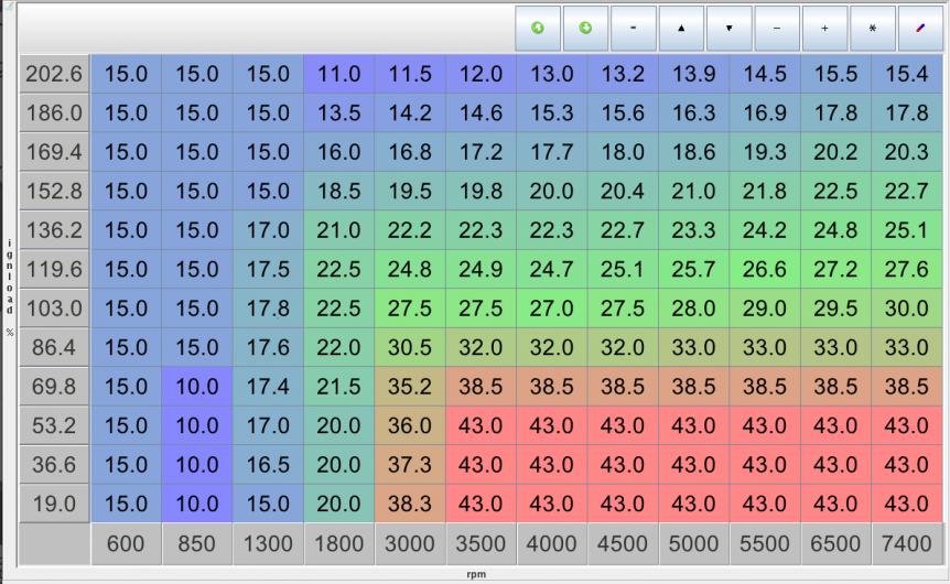 The overtly rich AFR has been mostly tuned out as well. Here's the timing/AFR tables I'm currently running. The AFR table is a mix of economy and probably overt safety. The timing map is a conglomeration of reading about 1000 posts here, and trying to come up with something that errs far into the side of safety, but not completely crippling power. Remember these are 100% seat of the pants numbers, none of these values have been verified by anything other than bachelor-frog "feels good man" tuning methodology: