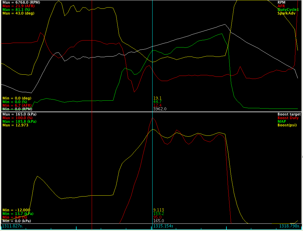 My plan for the next few days is to keep bumping the requested boost until I reach 10-11 psi. For some reason when things are working well the ecu levels things out 5-10kpa lower than my requested values. So if I have 165 across the board requested, it'll give me 155-160. Since it's consistent I'll just keep bumping the requested by 5kpa at a time until I reach my goal.