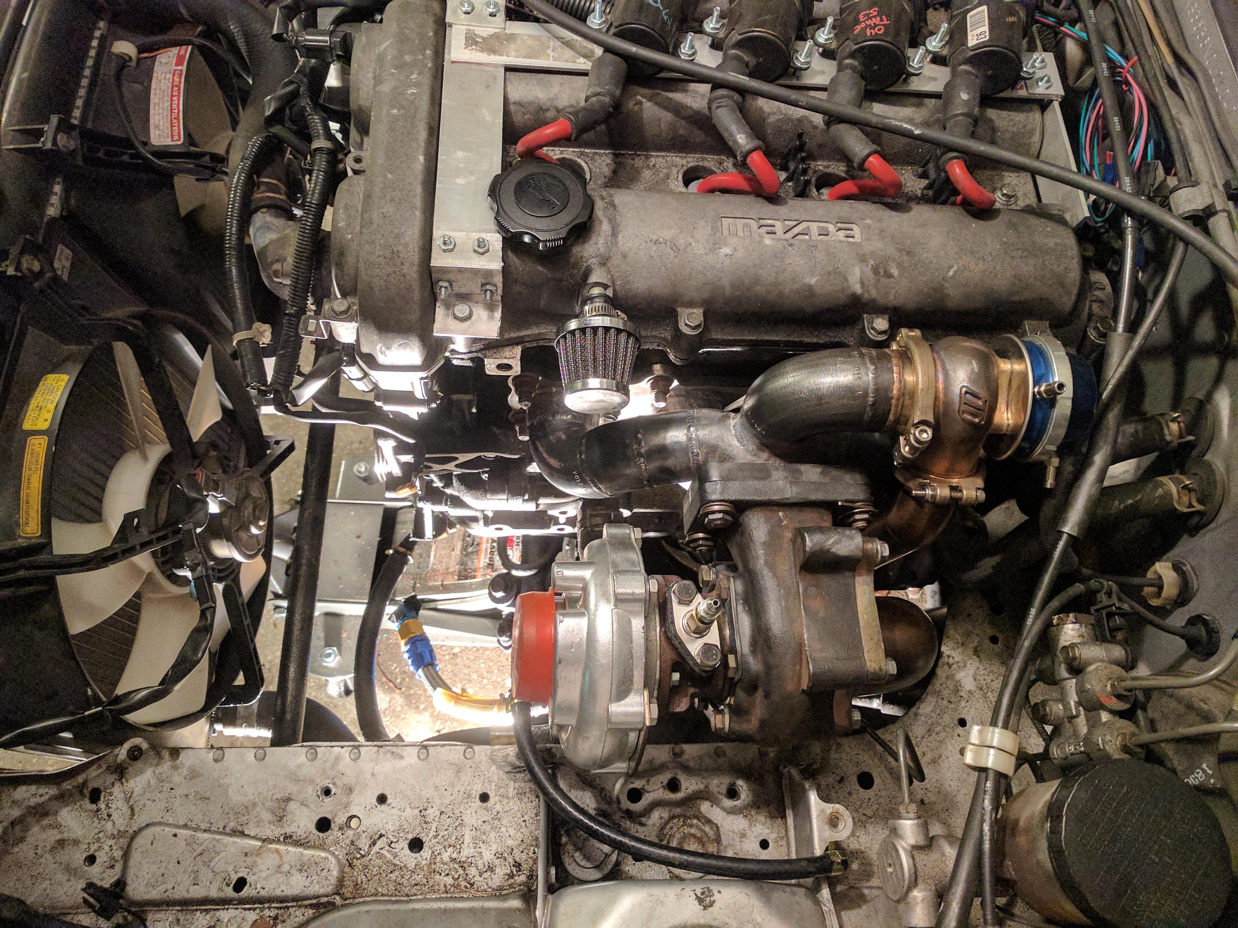 While the change in intercooler plan isn't ideal, it will save me some time, the guy I bought the turbo from even included his mounting bracket for the MSM turbo so that should go quick. So, remaining tasks to get it back on the road include: install intercooler and piping, Get oil lines hooked up. Route all my vacuum lines, Install deezums catchcan. Get the bumper back on. Tune.