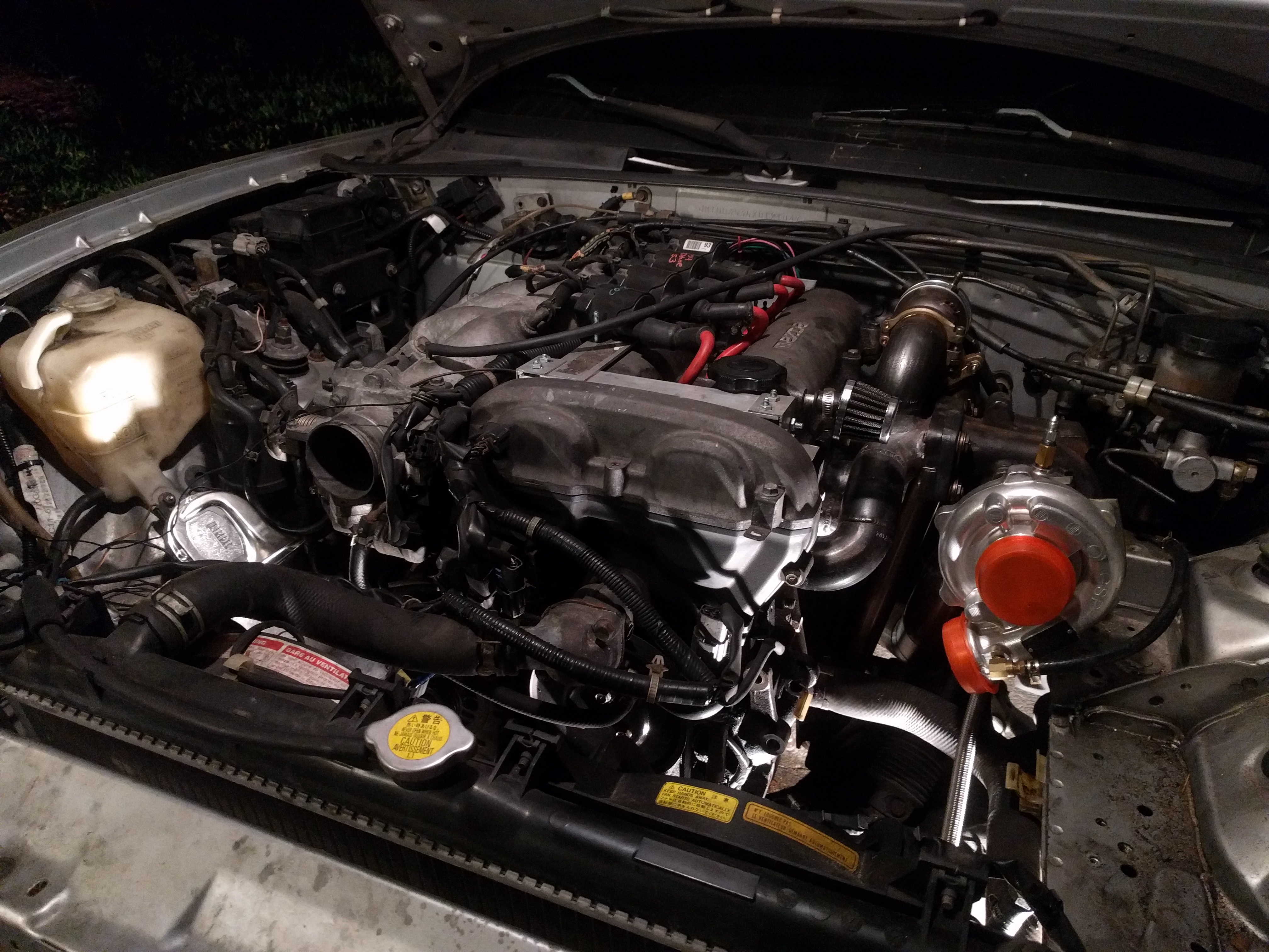 My time is pretty limited so I've been working a few hours each night after the kids are in bed, which means slow progress. I also did a looped lines PS delete which I spent more time fiddling with than I anticipated (story of every car project ever). As of last night, I've got manifold, turbo, EWG, and downpipe all bolted up. Pictures of the current state attached (please excuse the dirty engine bay). Unfortunately I have to get the car back on the road Thursday (it's my daily for a few more months) which is a bit of a constraint, and will require some issues to be revisited later. A few challenges I've run into so far: First, the oil pan was tapped by the previous owner and is shifted a little bit off from the "standard" location, so the oil drain line included with the turbo doesn't match up, I'm planning on an additional 90 degree AN fitting which should get things pretty close. The guy I bought the turbo from put together a nice cold air box for the intake. Unfortunately, the piping I have isn't going to get it in the correct location for that to work, I'll get some additional piping to make this work later. Also, I spent a while planning and starting to a fab an intercooler mount using the OEM AC brackets as a mounting location, but I realized that the MSM intercooler piping I have isn't going to work in that location without more modification than I have time to do right now. As a result, I'm going to run the MSM piping and intercooler in the same manner as the previous owner of the turbo, until I can order additional piping to get my larger intercooler to work. I will probably go with entirely new piping and scrap the MSM stuff. That also means I'm going to leave off the air guide and undertray (I don't want to cut them up now when I now the pipe routing is going to change a bit). Hoping I don't have any cooling issues, but the reading I've done seems to indicate I'll be fine on the street.