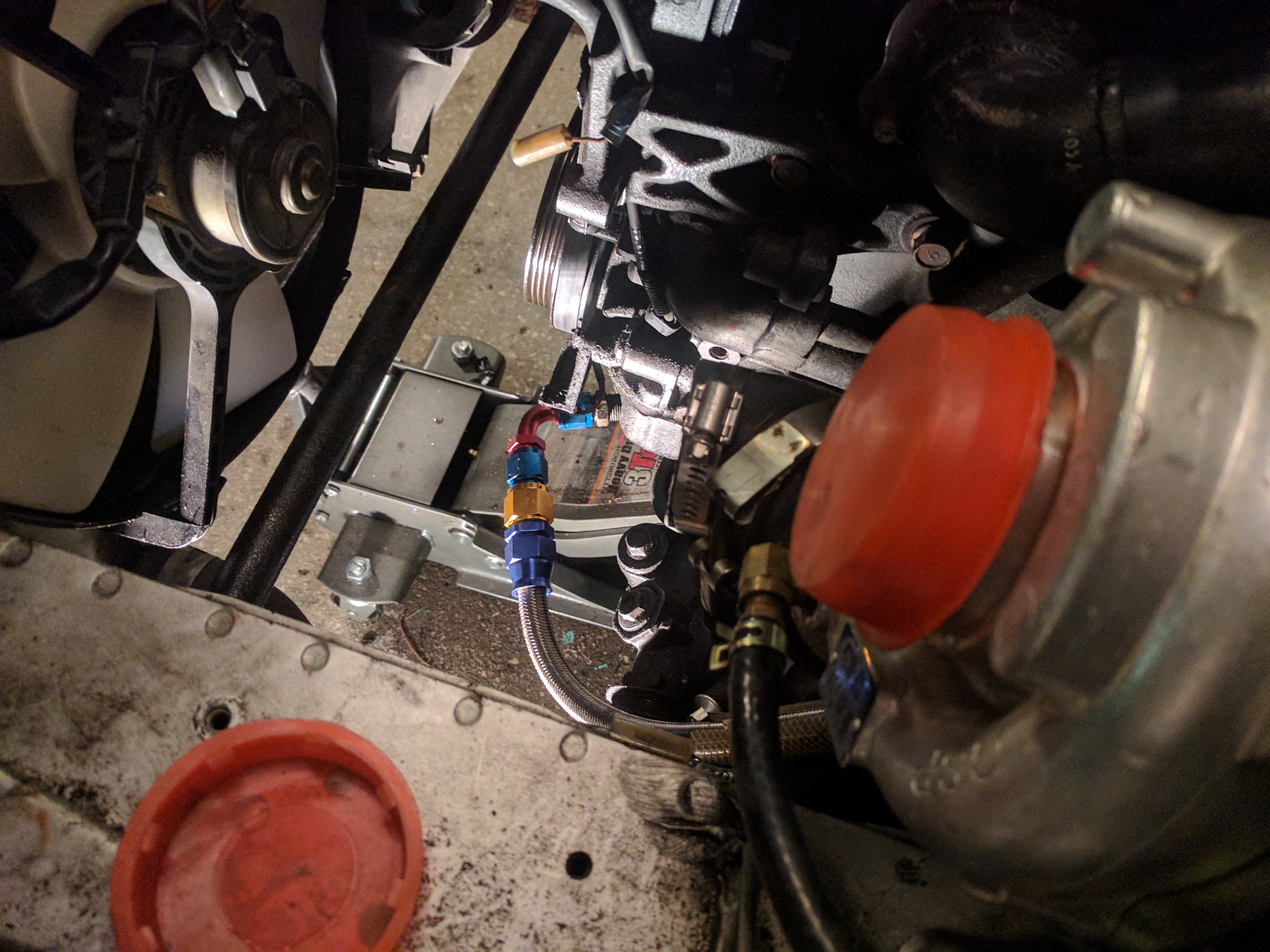Made progress last night. Oil lines are installed, the 90 degree bend worked well to get the oil drain lined up (Pic 1). MSM intercooler and piping are installed. I got the wrong size vacuum line so I need to get back to the auto parts store to finish the vacuum lines.