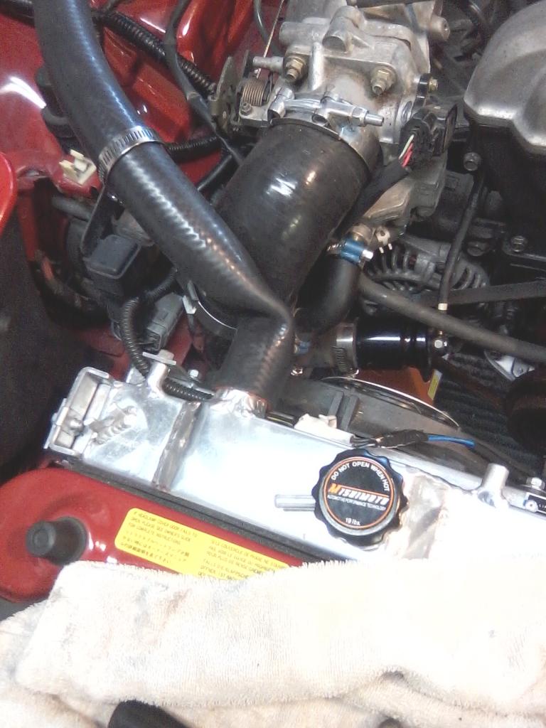 Only leak is at the inline t-stat housing. Letting it cool now, gonna see if i can't mend it while it's on the car. It's just so massive i can't get any wrenches in there to turn it.