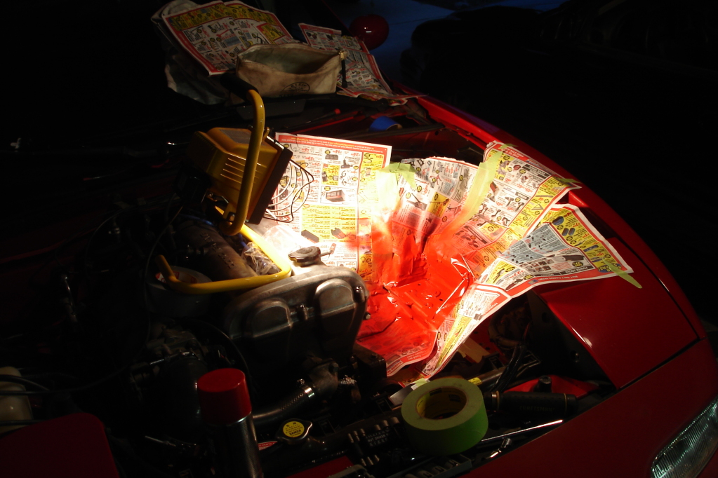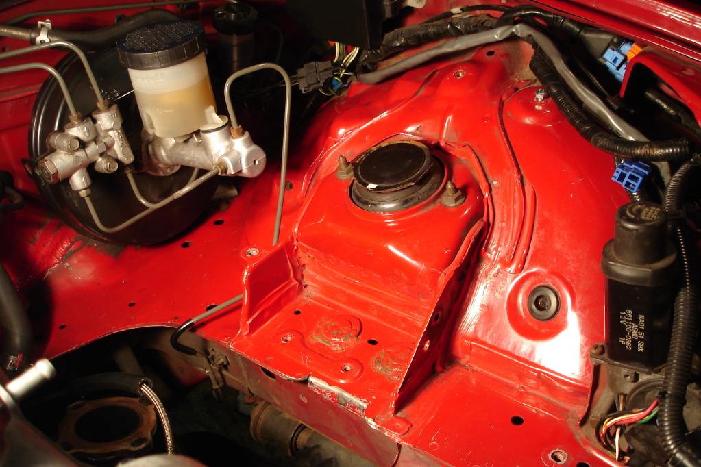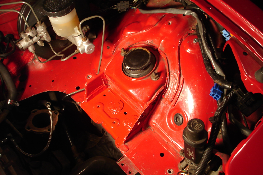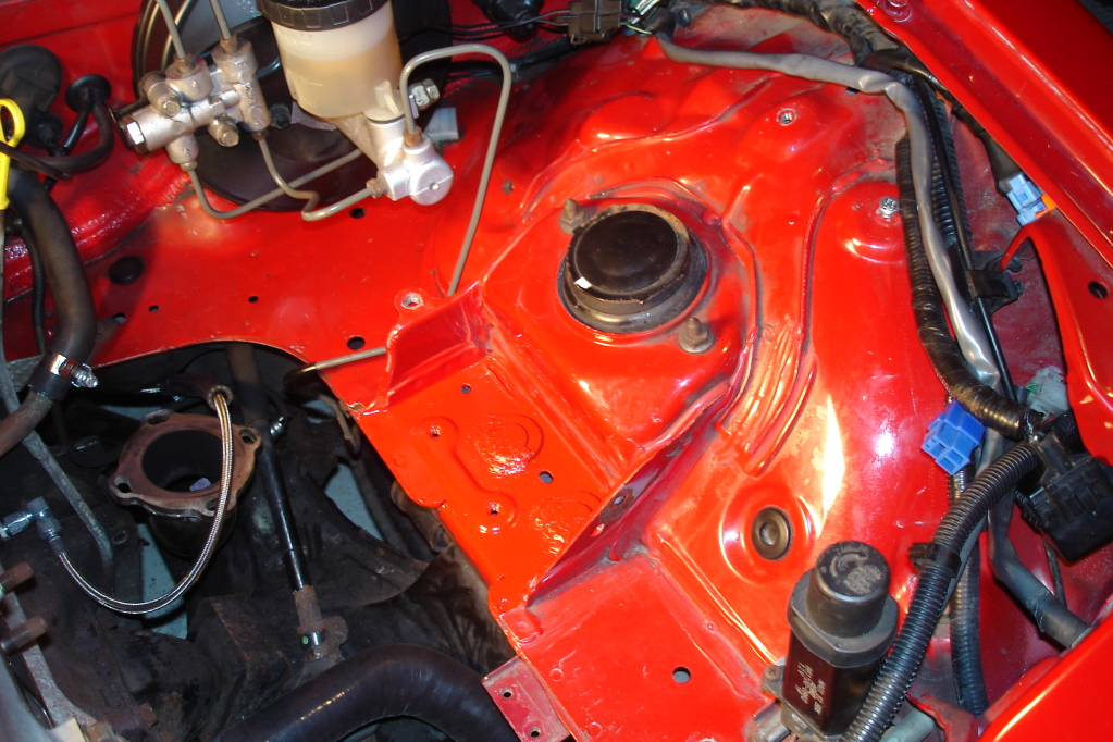 Then because i was bored as hell, i decided to paint up this little rusty nasty bit of crap. Plus that little piece i had to fold down out of the way to make the turbo fit. I really have no idea what i'm doing with this, so it's not the greatest. I also wanted to use a high temp paint instead of something that was color matched perfectly. So i may catch flack for that, but it's close enough i think. I also did a bunch of degreasing and grime removing on this side of the bay.