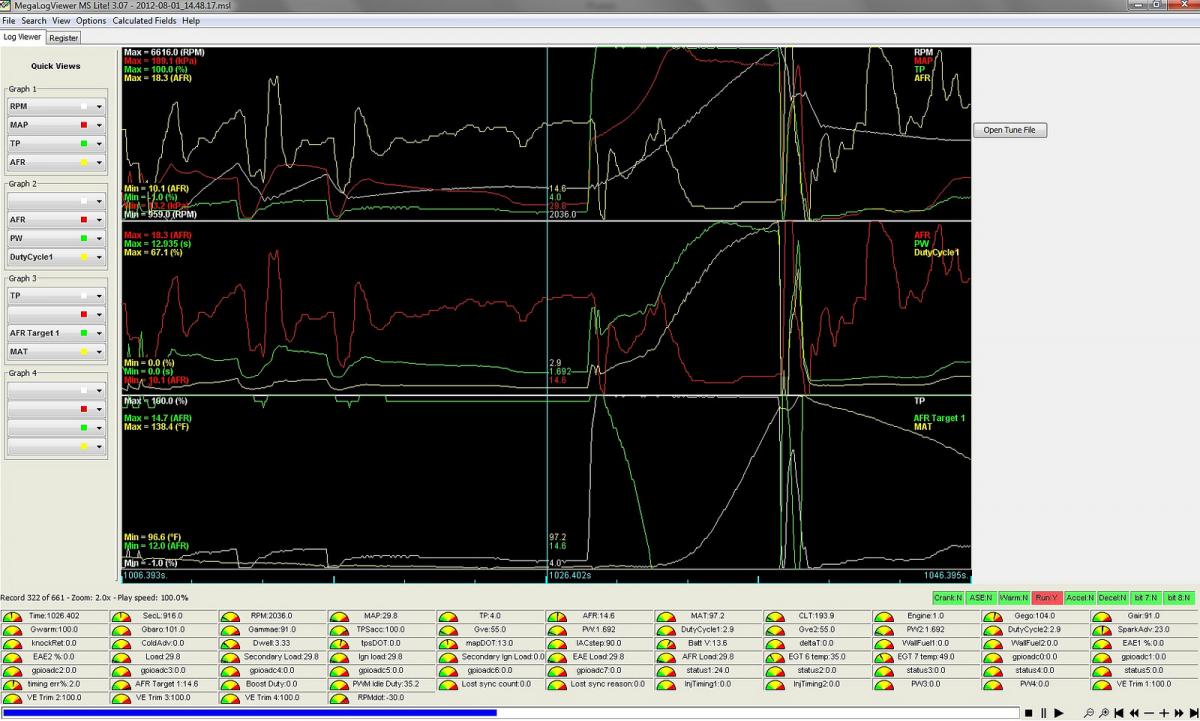 Hmm, i just found when reviewing this datalog that it's saying i lifted at 6600rpm, when i'm pretty sure my tachometer was at like 6900. I think the tach reads a little ligh, which would also explain why i don't bang the limiter i set at 6800 all the time. Anyone else experience this?