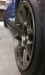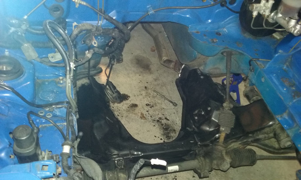 Flywheel is back resurfaced, Wheels came in i put them on 205 50's. Also we decided to get it remote tuned, we were having a few complications with mspnp 1.3 and its just easier for now to focus on all the other aspects. Probably later i will upgrade to mspnp2 or ms3. Last night we test fitted the wheels than put it up and started the tear down. Exhaust removed, coolant drained, fuel lines disconnected, intake off, just prepping so we can pull the motor. I believe when we get back over there this weekend we can get the motor out to do the timing, clutch, fix coolant leak, clean paint block and clean transmission. In the mean time i am going to drop off the pan and have the bung welded. here are a few pics of last night