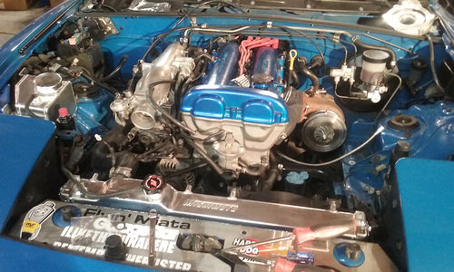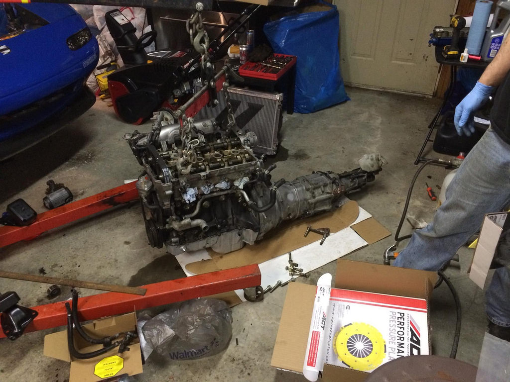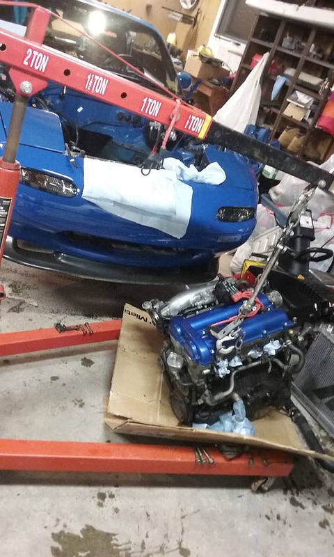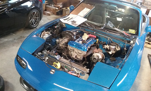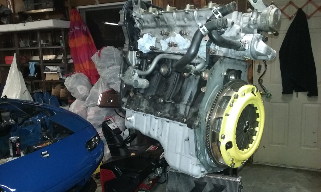 Flywheel came in, sent out to get resurfaced. I also brought my car to my brothers so that i could get started on this fun project. i honestly think my buddy is more excited for boost than I am. I will say however after three months of hibernating it was great to drive it again. I also just ordered a new handbrake from garage star same as Sharka, and a new badge for the finish panel from Adam to match my front emblem that i already have on, also took advatange of Moss Miatas free shipping and ordered my harness bar. Tomorrow we are planning on starting early and getting MS in and hooking up my wideband. Tracking shows that Boost and vtps should be in today and the Jongbloeds should be here wednesday. As well as an email back from MR. Injector about my injectors being shipped back to me(great communication and turn around) The only unfourtunate is that FM still hasnt shipped my kit out something about waiting on one clamp, but hopefully that will be this week though we do have alot to do before than. Plan is install MS, install injectors, pull motor and tranny fix coolant weep from reroute install Act clutch and do my timing belt waterpump and rear end, Than install turbo and build exhaust.