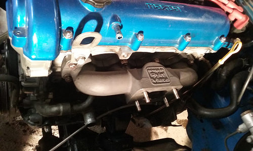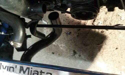 Well I hope everyone had a great weekend, it looks like the winter is leaving us here in NE. Saturday we accomplished alot for not thinking we were gonna be working on the miata. We placed the VC, hooked up fuel lines, cut shelf (per FM's instructions), I remounted the as box with ac fully removed, test fitted more ic piping and mounted the manifold. Also we finished bolting in the harness bar and went to clock the turbo, than realizing the waste gate actuator bracket is not accurate for this setup. Justin says we will have to do some customizing on the bracket. Now on to the crappy side, Yesterday we went over to the dakota. For a wopping under 50k it is in my eyes awful shape and a pain compared to a simple miata. Tuesday we have to finish pulling the motor, than push the truck out to pull in the other truck he bought for us to pull that motor and put back in the first truck.YAY! hopefully it can go smoother and we can get it back together so we can get back to the miata.