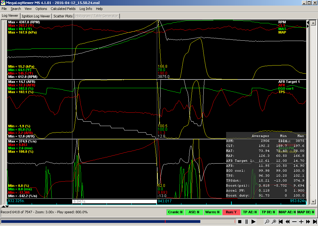 I was having some trouble with oscillation on my EBC during spool up. It was fine running through the gears but spooling would give me oscillation. I think it was mostly because I tried to use the old turbo settings as a starting point, big mistake! So tonight it looked much better, only one good log and I started from 3rd but this would have given me the problem before. A couple more runs to get it right, then I will call the dyno.