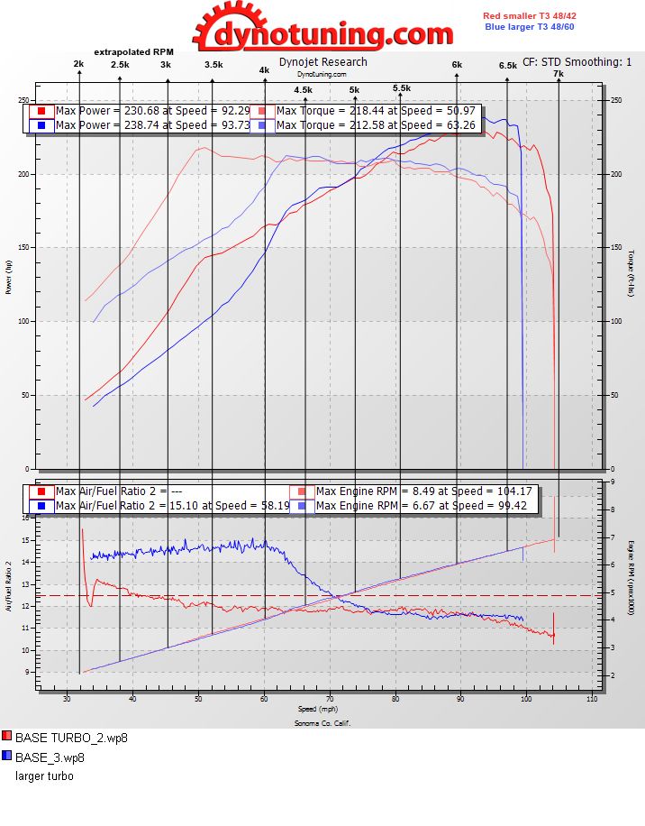 Very little difference overall besides the spool difference. Red is the original smaller turbo blue is the larger .60 a/r compressor side.