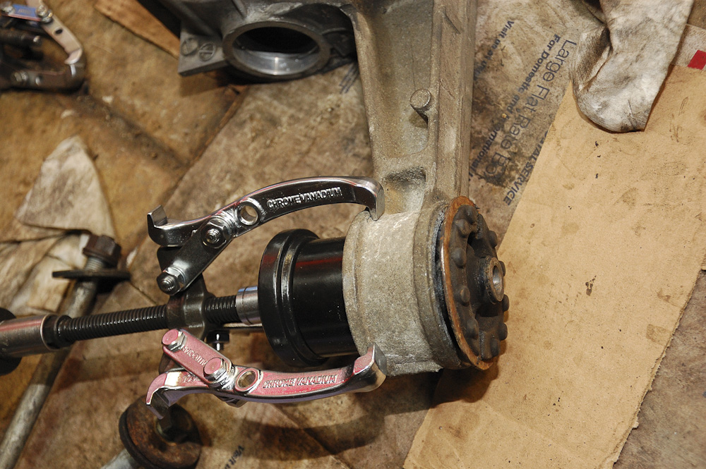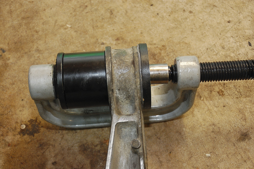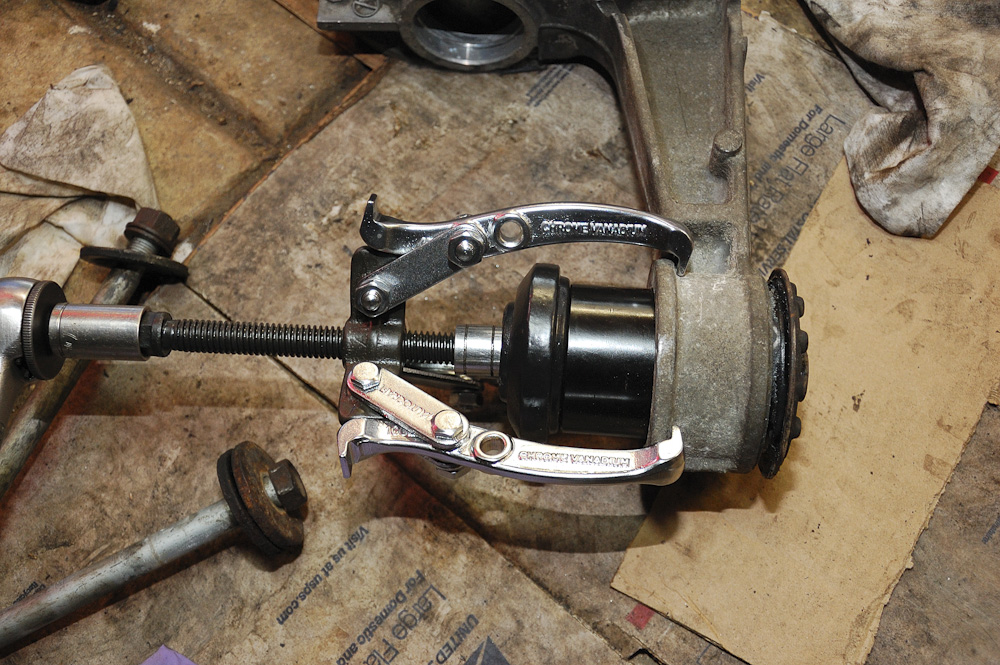At this point the diff bushings were still in. I figured, damn, I don't have an easy way of getting them out. So today over lunch I went to a repair shop and asked if they could press the old bushings out. They basically bitched that it's too much work. I said ---- it, went to Advance Auto and bought a $25 4" puller. This, combined with the parts from the ball joint press from Harbor Freight = awesome tool for removing bushings. It's super easy.