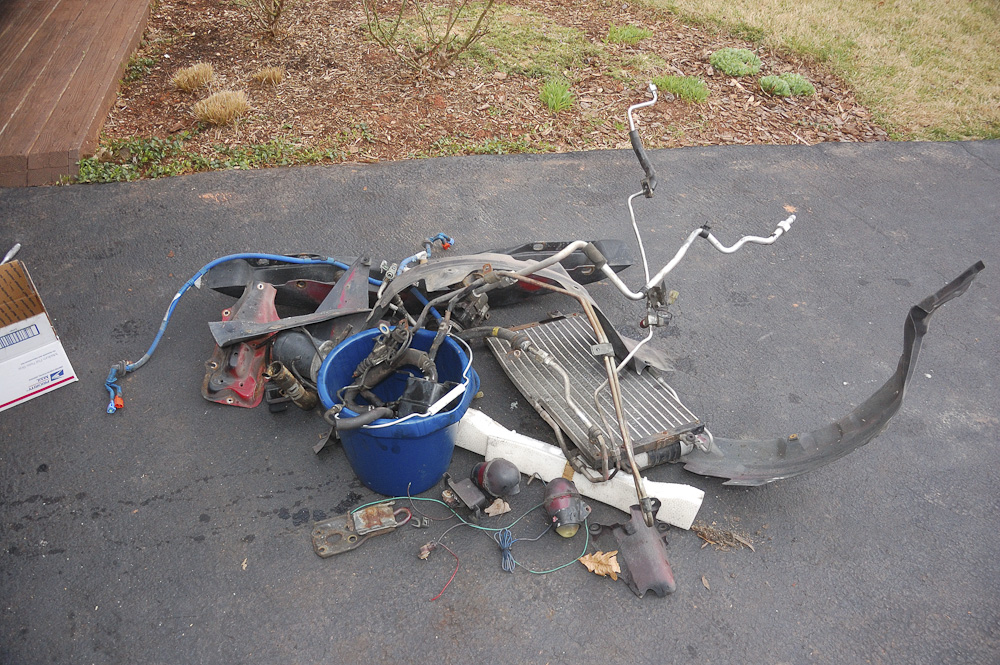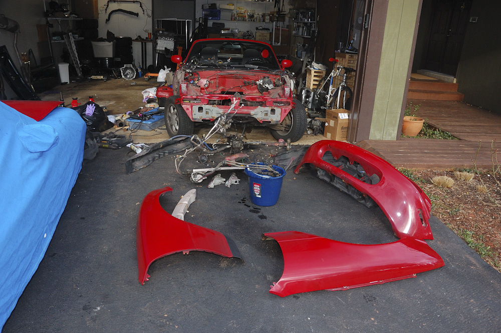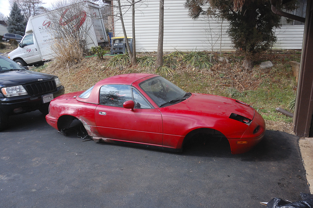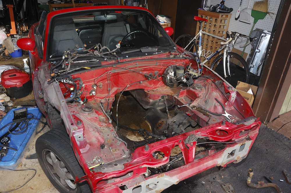 Then we cleaned the garage and pulled the motor. This afternoon I started stripping and cleaning the donor car. I'll clean up some more tonight but basically making good progress. Also dragged the old shell out to the driveway. I have a leet mazda car cover so neighbors won't be scared by the ugliness of the old shell.