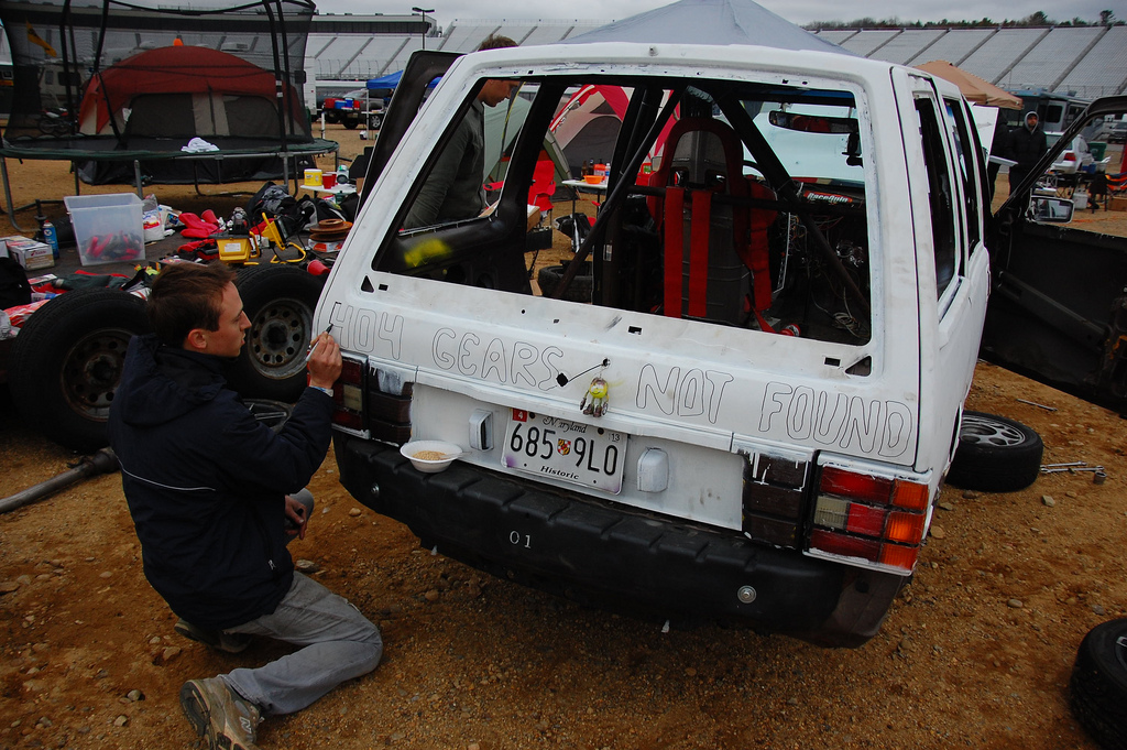 Our car was a 1986 Nissan Stanza Wagon with a CA18DET swap. Quite fast for a lemons car but a pile of **** in every other way. Saturday ended with 3&4 gear shifter fork breaking, so we fixed it by welding 4th gear. Surprisingly, it worked like a charm! However, the clutch died 3 minutes before checkered flag.