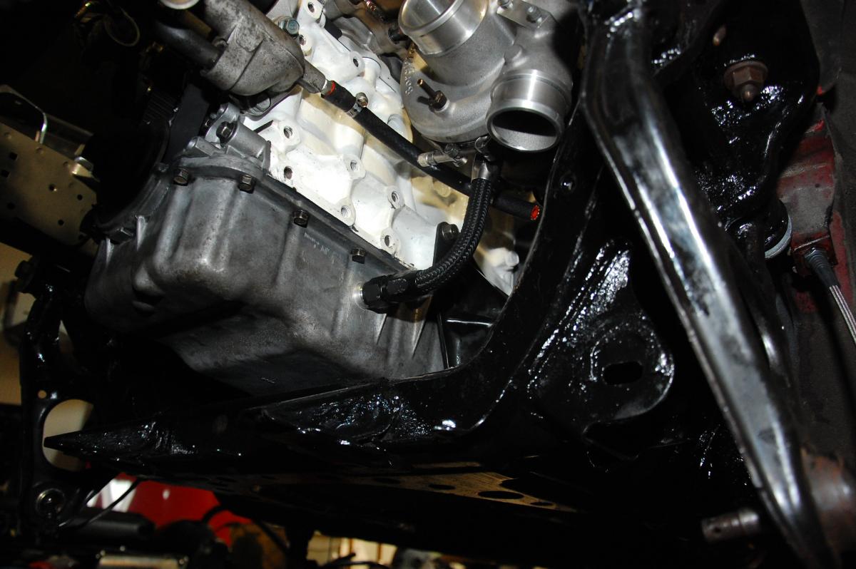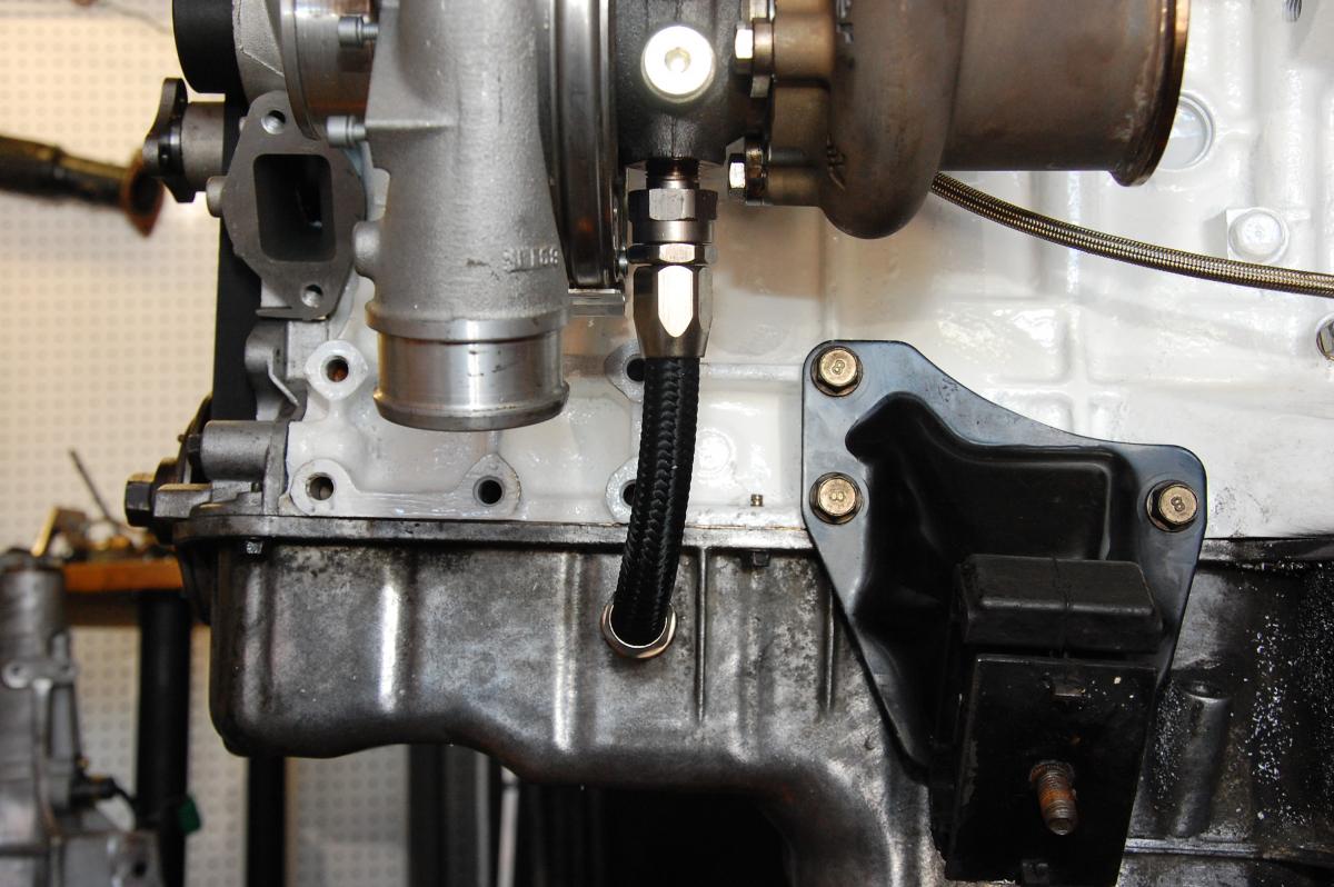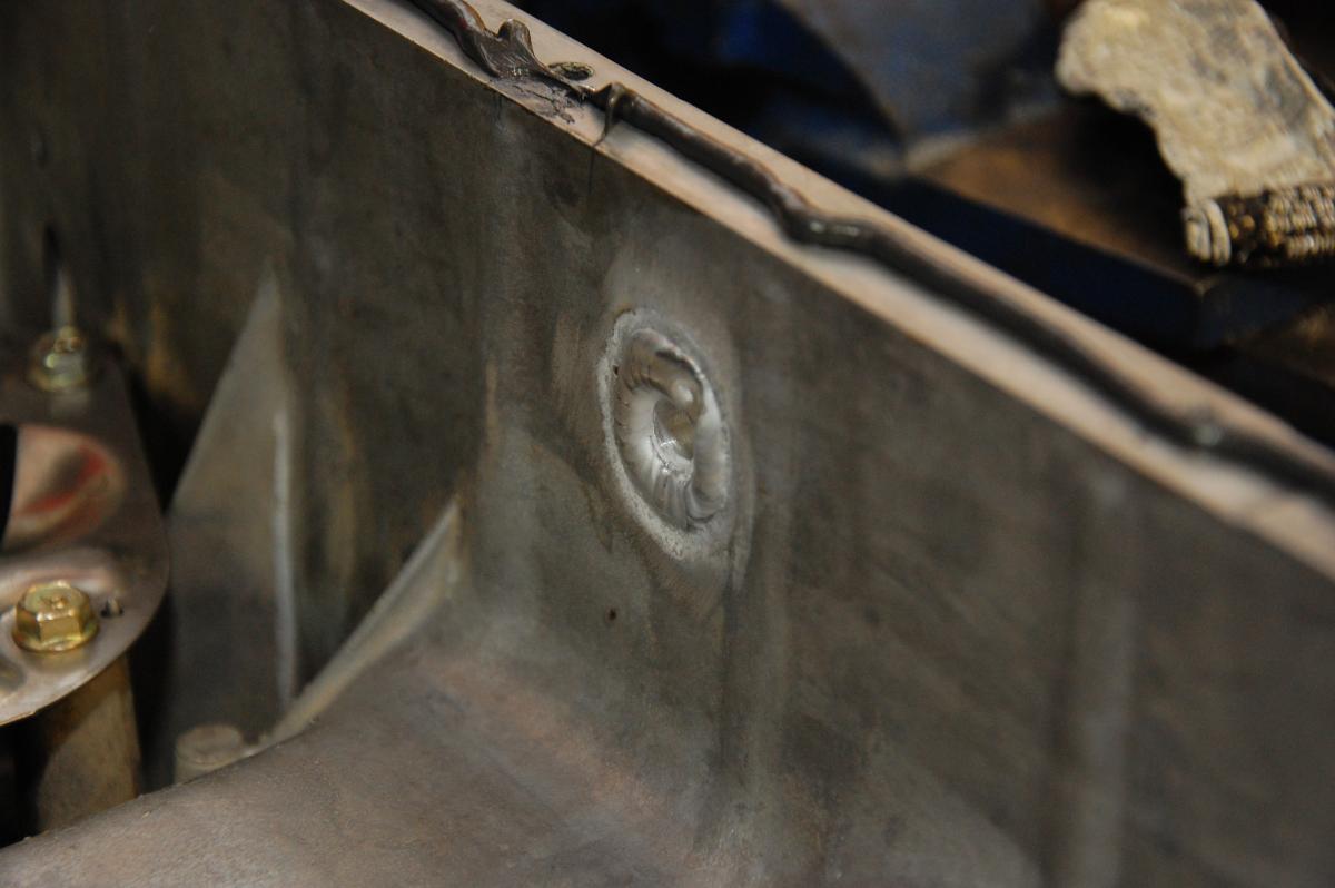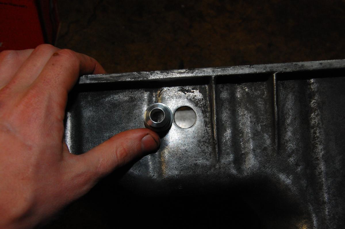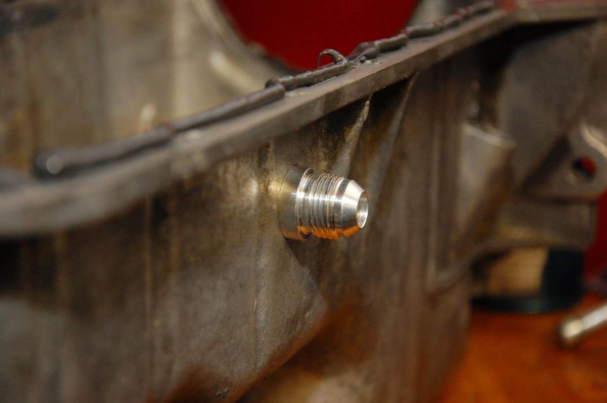 I decided to get an -8AN bung welded to my oil pan. First I tapped it pan right below the turbo but it didn't work out. The 3/8 NPT to -8AN fitting bottomed out and still wasn't tight. I either stripped the threads, tapped it wrong, or the fitting is ----. In either case I doubt it would seal.