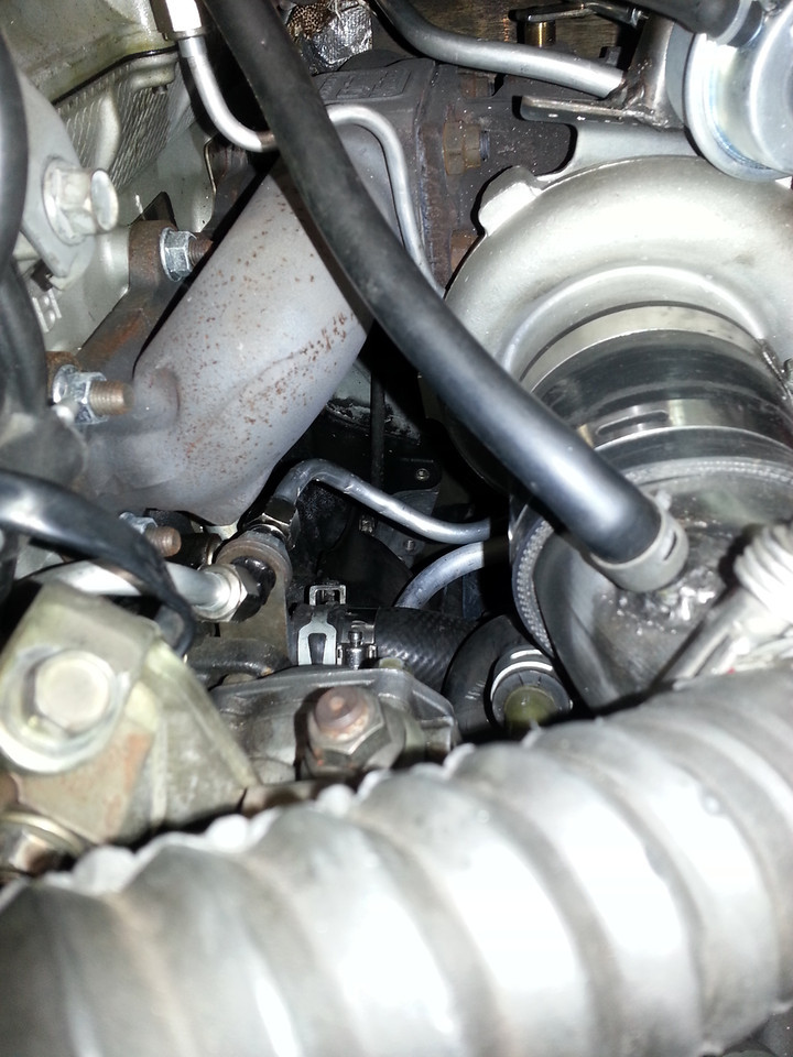 Bad news: I've had one crack! I put a huge loop in the turbo water feed to make room for wrenches - this was all done out of the car so I thought I'd have more trouble than I did. It was obvious (that big loop you see) was just flapping in the breeze and I was being optimistic.