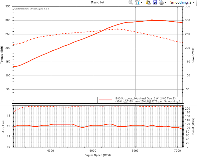 Changed AFR target to more E85-like targets (e.g. 12.2 in boost). Went to do some pulls/street tuning at 5am. Checked Virtual Dyno and it says I make exact same power as I did in October on virtually same settings.