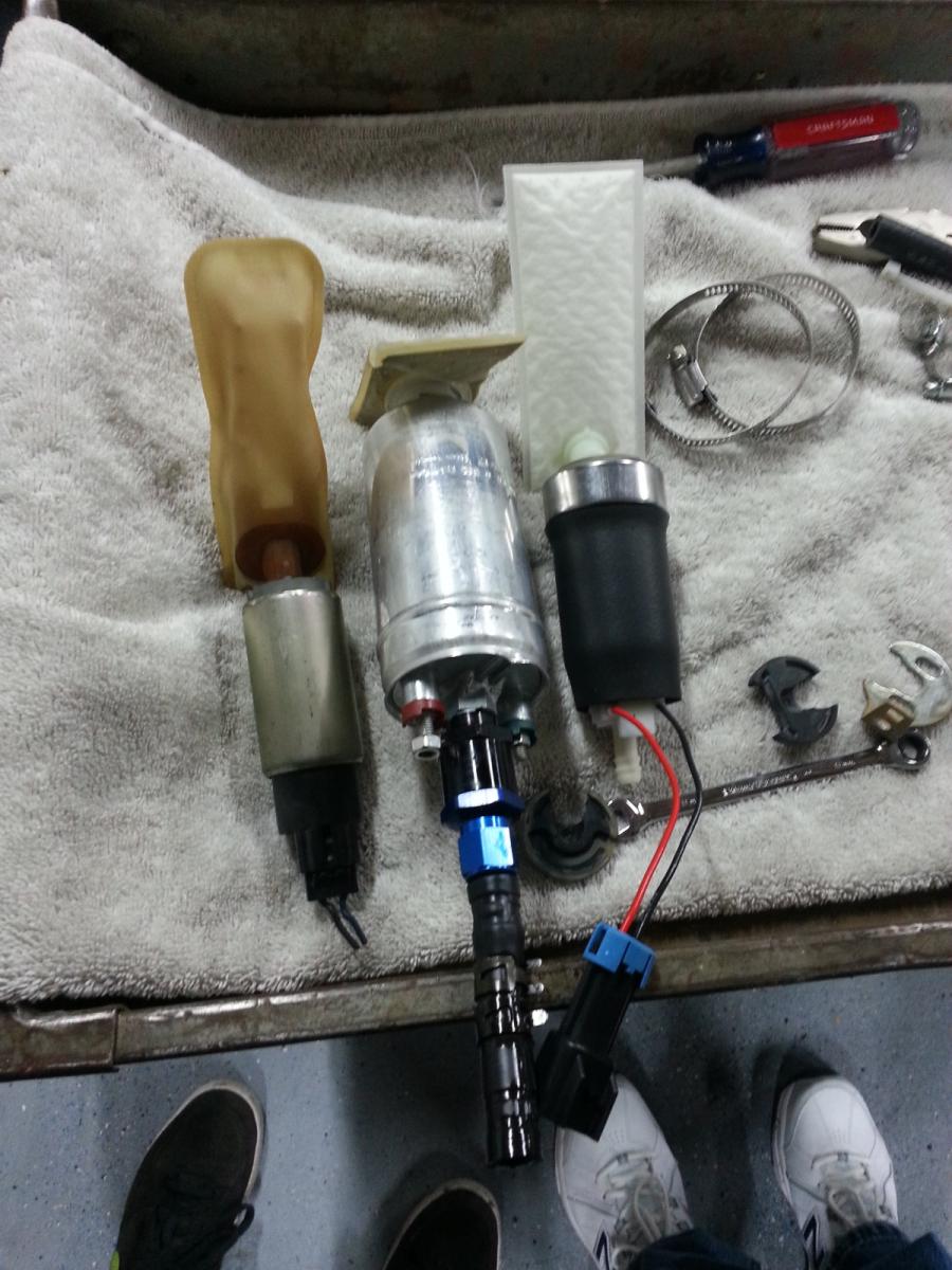 So fuel pumps. Below you'll see left to right in terms of capacity the miata fuel pumps I have, the stock one, the 044 and the wally 400e85 aka the wally 465lph.