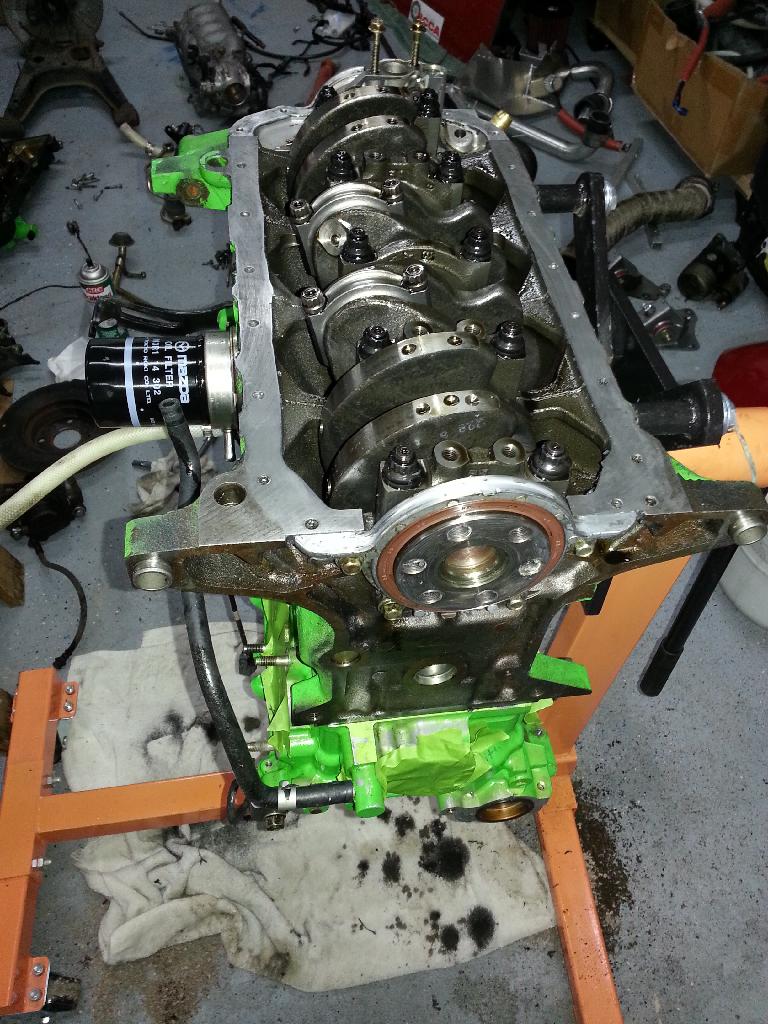 Also welded the cam trigger wheel onto the cam, that was an ugly weld. And pulled he pan to clean everything up again. Next weekend I can drill that hole in the block and do the valve cover AN fitting. Last night I put all the hard lines in the car for the brakes just havent done the rear line, seeing if I can get the whole line from mazda for cheap.