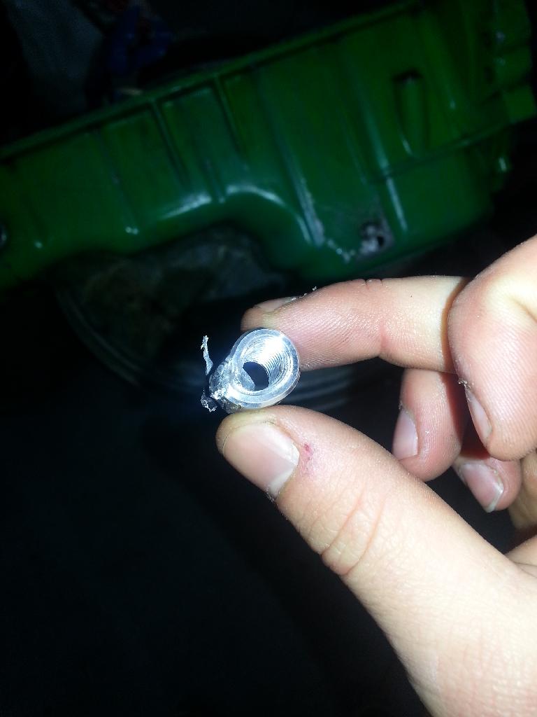 Trying to weld the bung for my oil temp sender into the oil pan. I was welding lefty but my brain was moving my hands like I was welding righty. Yeah... I ordered a few more from mcmaster and a big 3/8" one just in case. If I fail at all of that I'll just tap the pan for 3/8 npt.