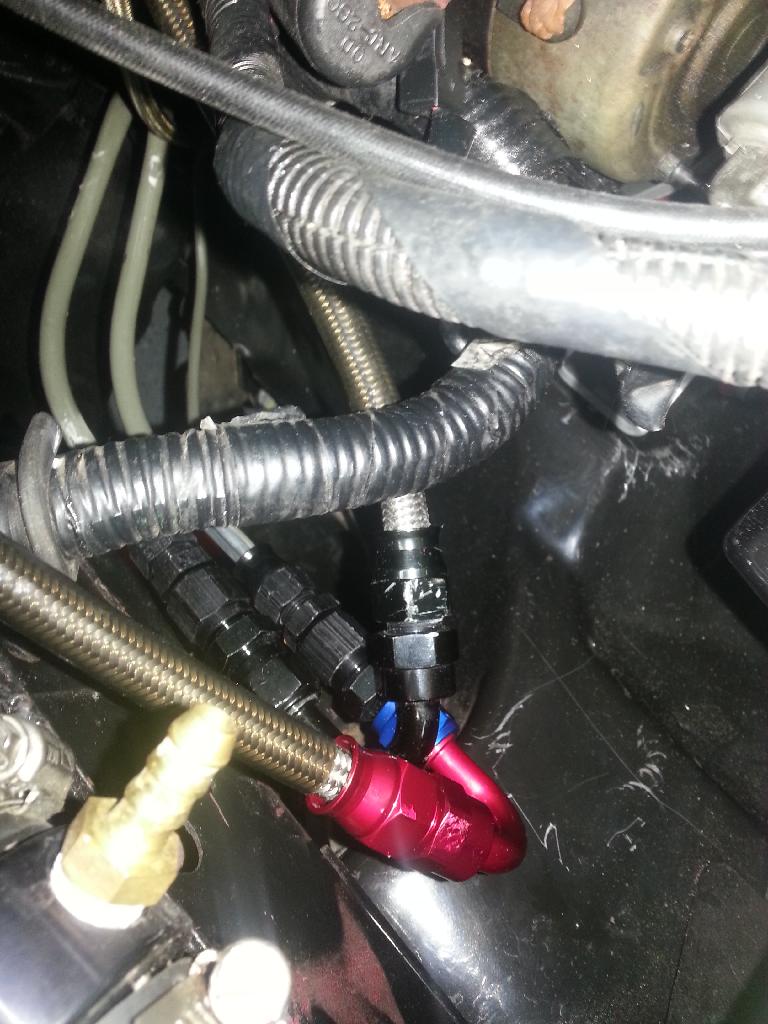 I also finished the fuel lines. The stupid POS AEM FPR is kind of leaking now. I cranked down on the bolts that hold the body together and it stopped for now. But on a good note, the car didnt catch on fire and explode from the fuel pump wiring.