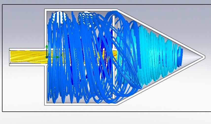 Well the air seems to take a predictable path. And I cant seem to make it any better by messing with the size and location of the separator plate or the size of the cone. I really wanted to get the air to tumble in the cone, but staying attached and swirling should work fine. At least the simulation thinks the air is going to swirl rather than take the short cut. If this isnt effective enough I can still add a 2nd chamber at the exit packed with scrubble and some baffles.