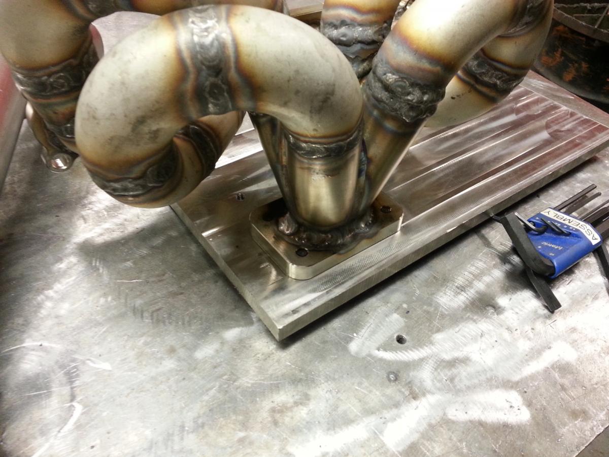 Tonight I managed to get the manifold finished. I gave up on the egt bungs when I found I couldnt get the drill press chuck to clear where I wanted to drill and found that drilling this pipe with a hand drill wasnt happening. Of course less than half an inch of bead in the coolant line on the synchrowave blows at school and I wasnt quite sure how to fix it and didnt want to **** it up more so I switched to the dynasty with the broken high frequency so I pretty much had to scratch start. And of course we had zero tungstens and I had to used a piece that was like an inch long. And I dipped it pretty badly and there was not nearly enough to be ground so I'm just going to finish the god damn thing this weekend at my house. As a bonus that lets me weld the v-band on the exhaust end. So I'll end up getting the turbo setup the week before dover and wont have time to install it rather than getting it the week before jersey and not having time to install it. Oh well. Wednesday I plan on sanding and adding another coat of gelcoat to the splitter and installing that this weekend.
