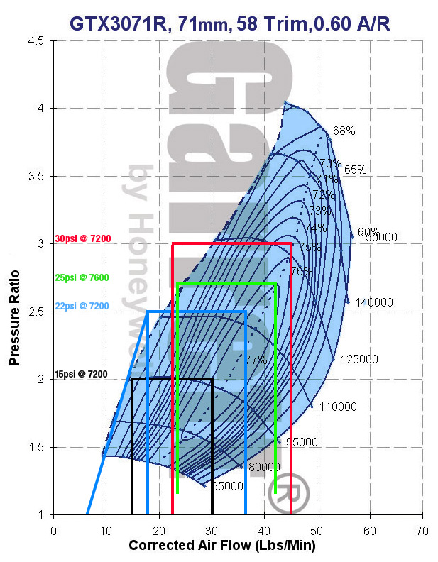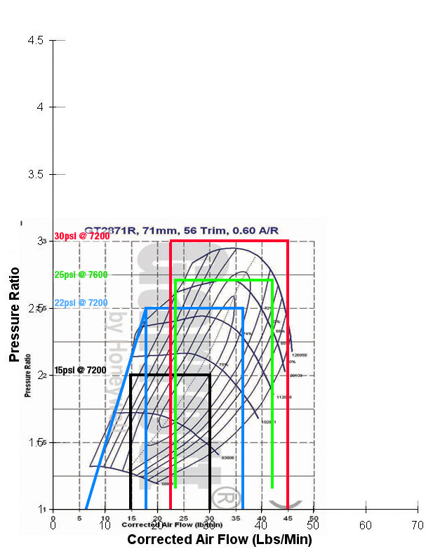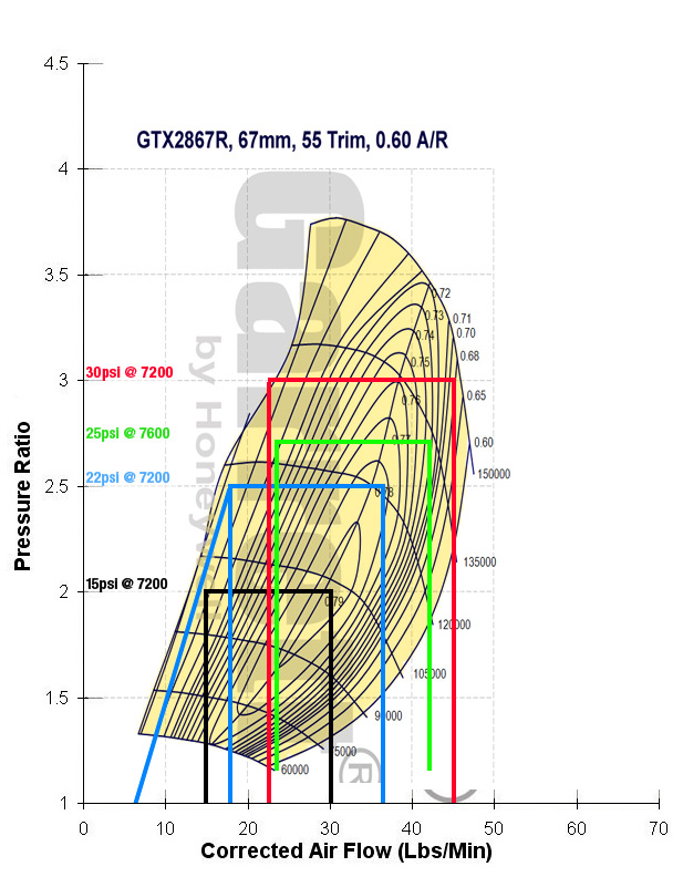 Edit: My first calculations were a bit off on this turbo, as I didn't scale it correctly. This now looks even better! Seems like the compressor is able to give 20psi all the way from 2800rpm to redline