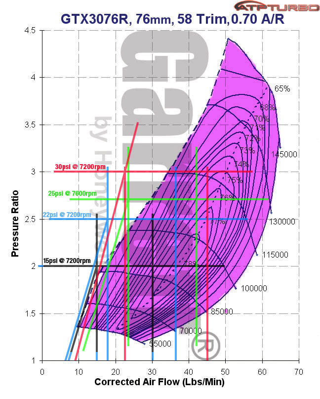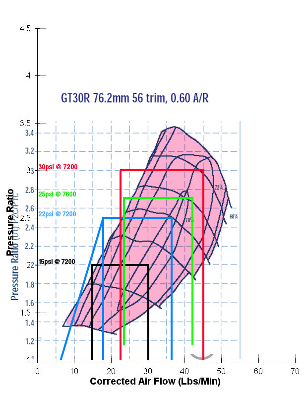 I've done a bit of calculations, according to Graham Bell's formulas, in order to better understand what would be the better turbo to select for my project. I calculated for 15psi & 22psi from 3600-7200rpms, then I did one for 25psi @ 7600 and one completely over-the-top at 30psi.