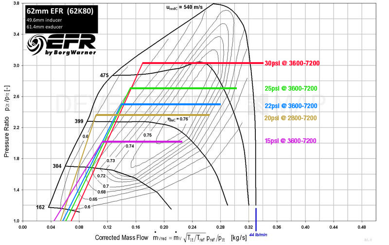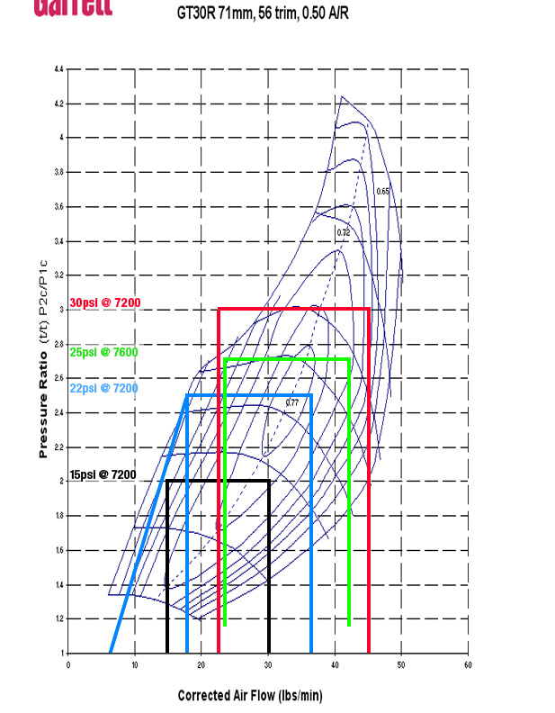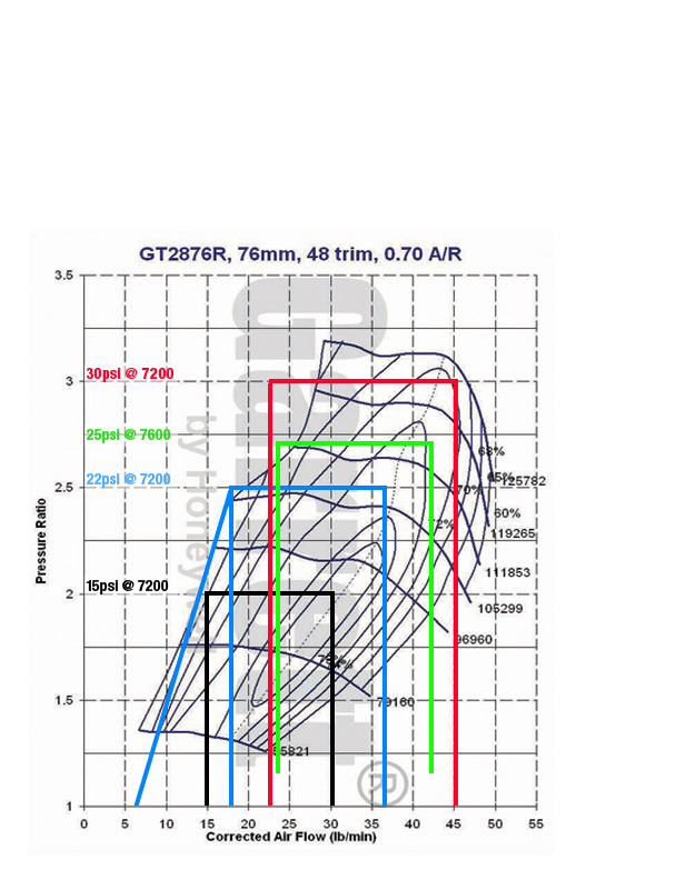 Not too bad at all!! No issues with surge and even up to the higher boostlevels it operates inside the most efficient area of the compressor, hitting the sweepspot at the end of the RPM-ranges. Would be awesome to see full boost closer to 3000rpms and yet reaching well above 300whp! I am a bit surprised that this turbo has not been mentioned either here or at M.net! Am I missing something here - apart from the fact that it's a fairly new device..? Will be very interesting to see how it compares in real life, once we see the first builds on the dyno.